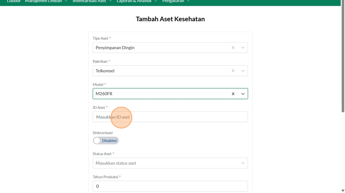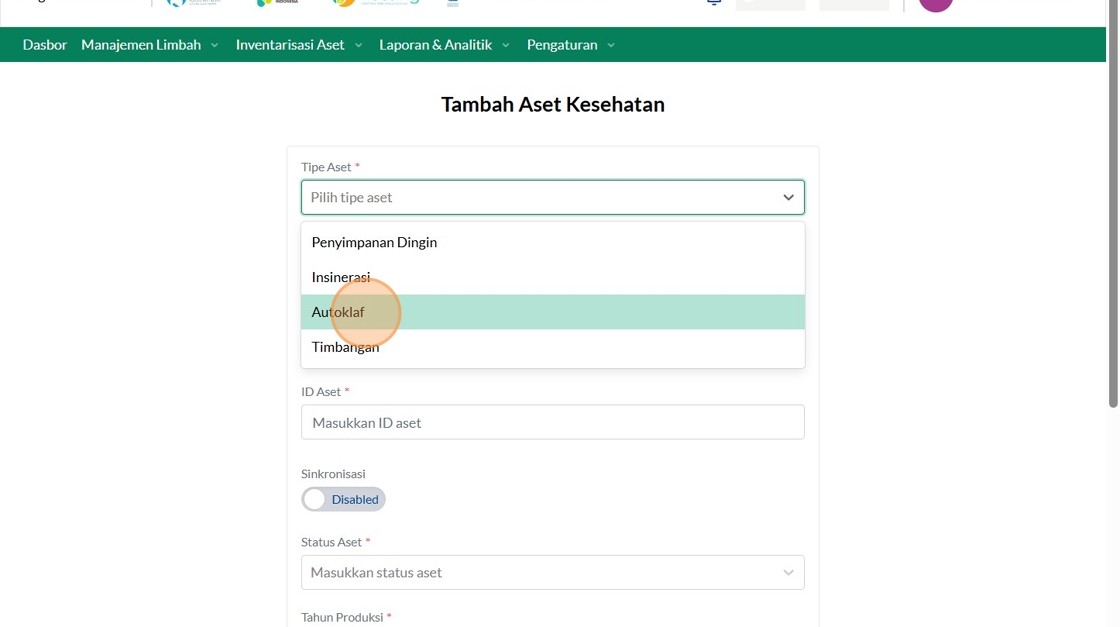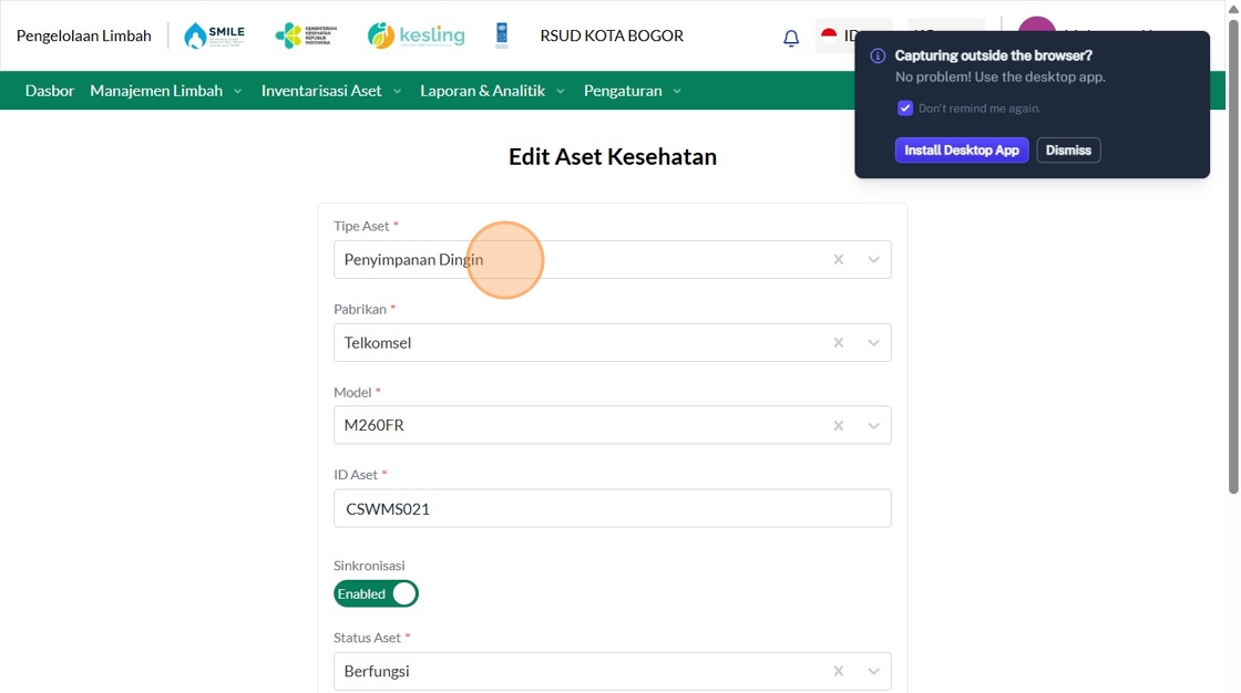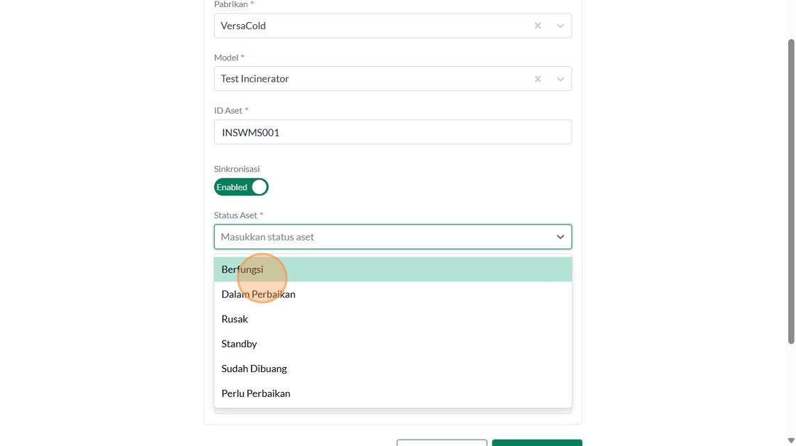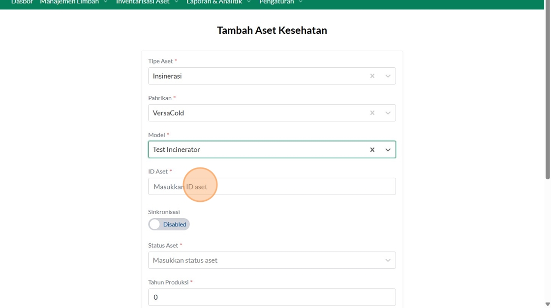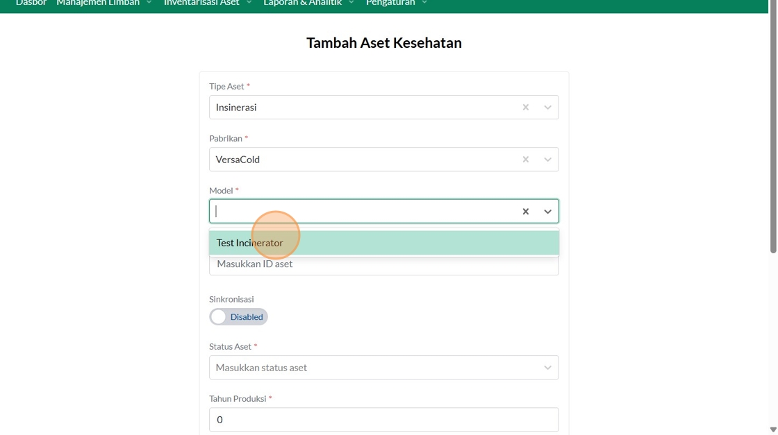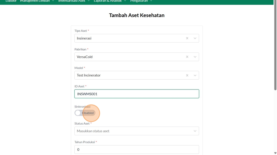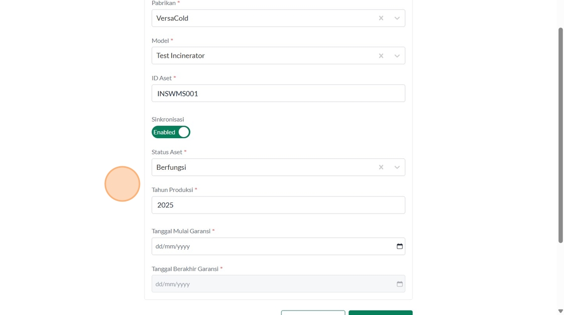 39. Click "Tipe AsetInsinerasiPabrikanVersaColdModelTest IncineratorID AsetSinkronisasiEnabledStatus AsetBerfungsiTahun ProduksiTanggal Mulai Garansi..."