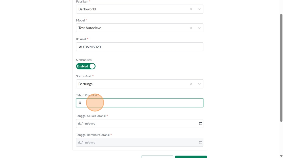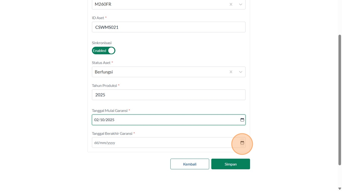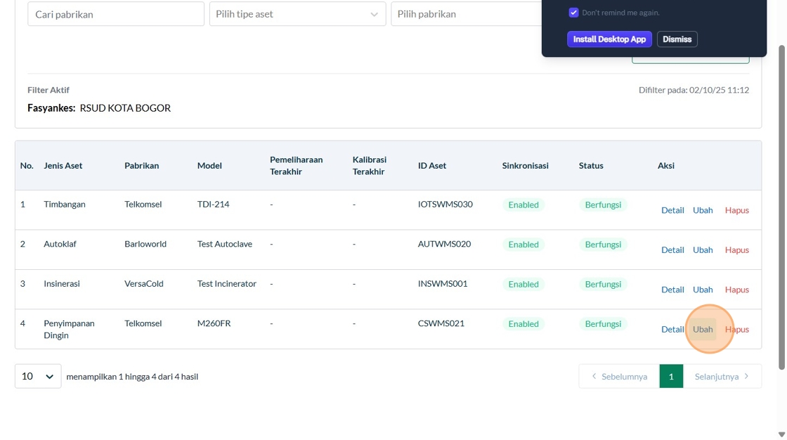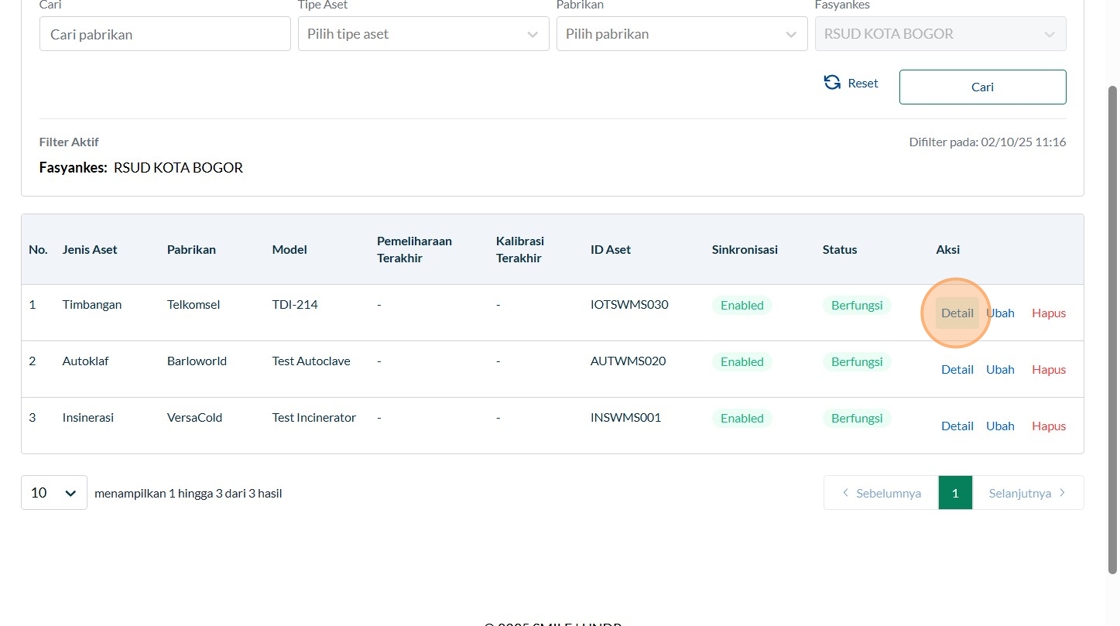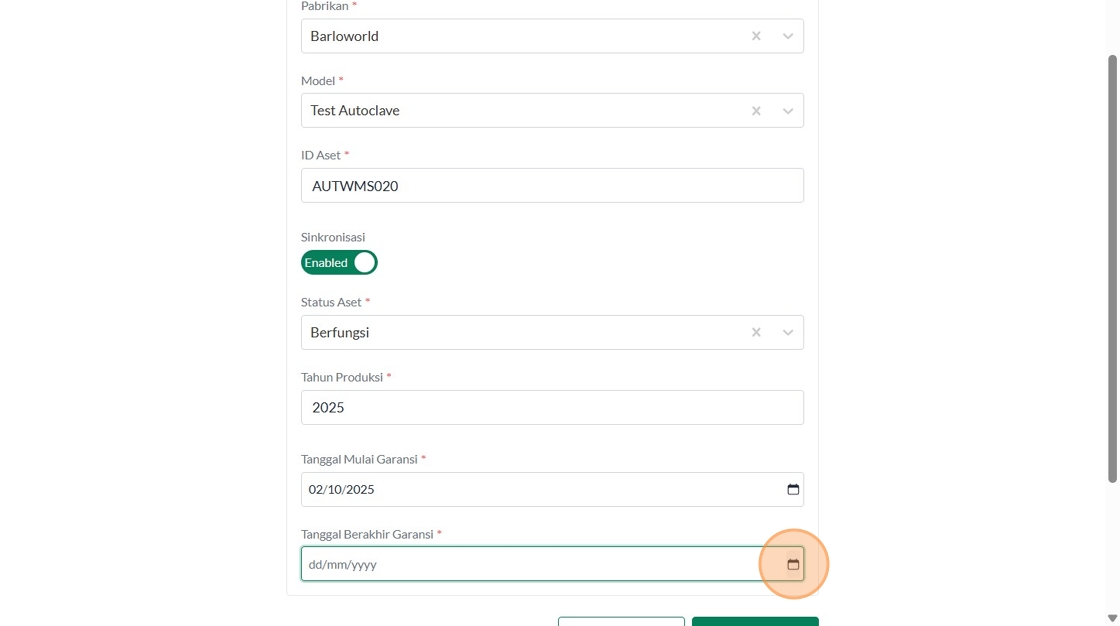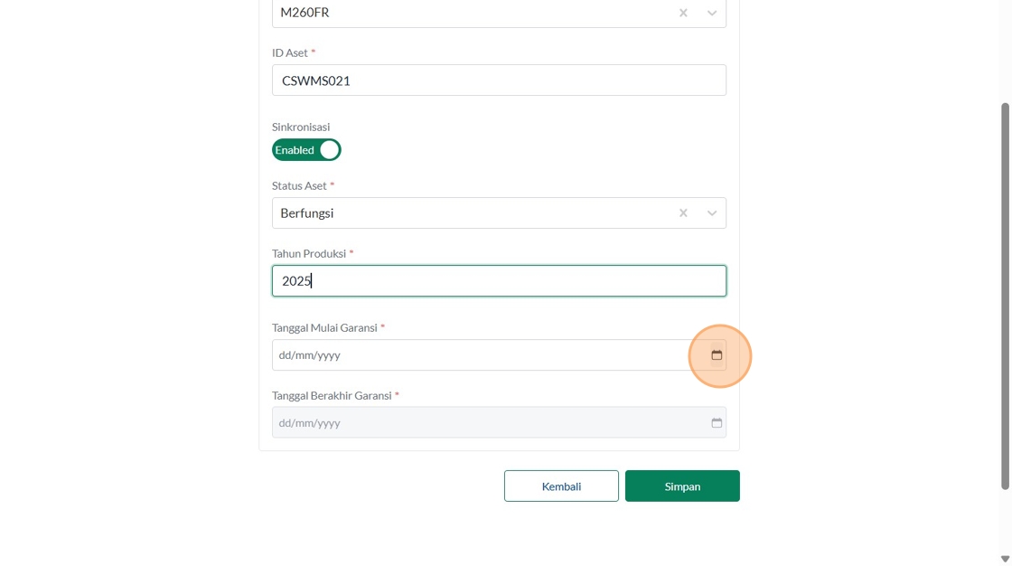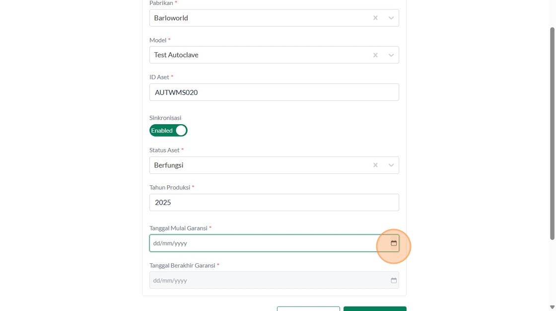 39. Click "Tipe AsetInsinerasiPabrikanVersaColdModelTest IncineratorID AsetSinkronisasiEnabledStatus AsetBerfungsiTahun ProduksiTanggal Mulai Garansi..."