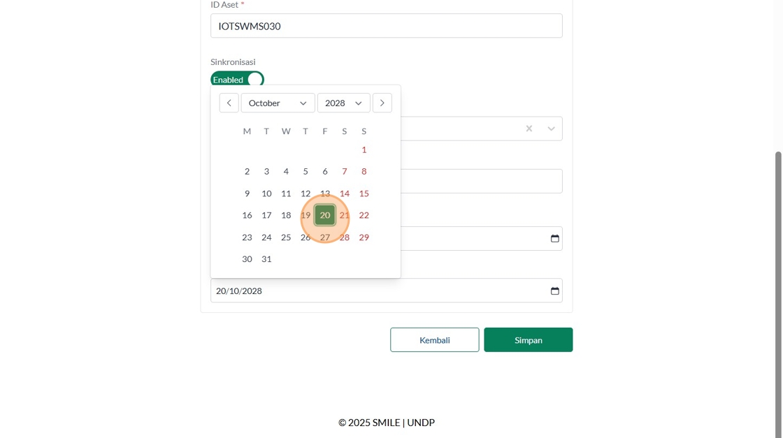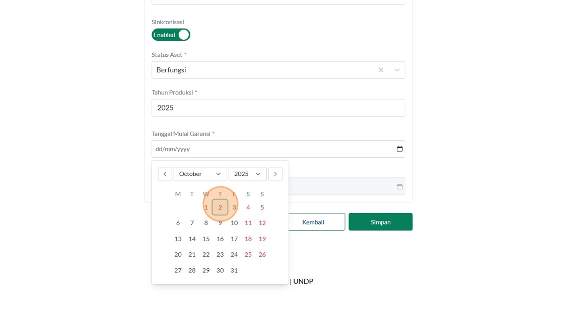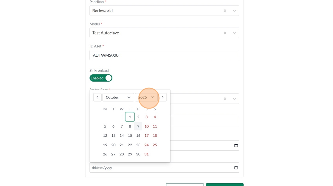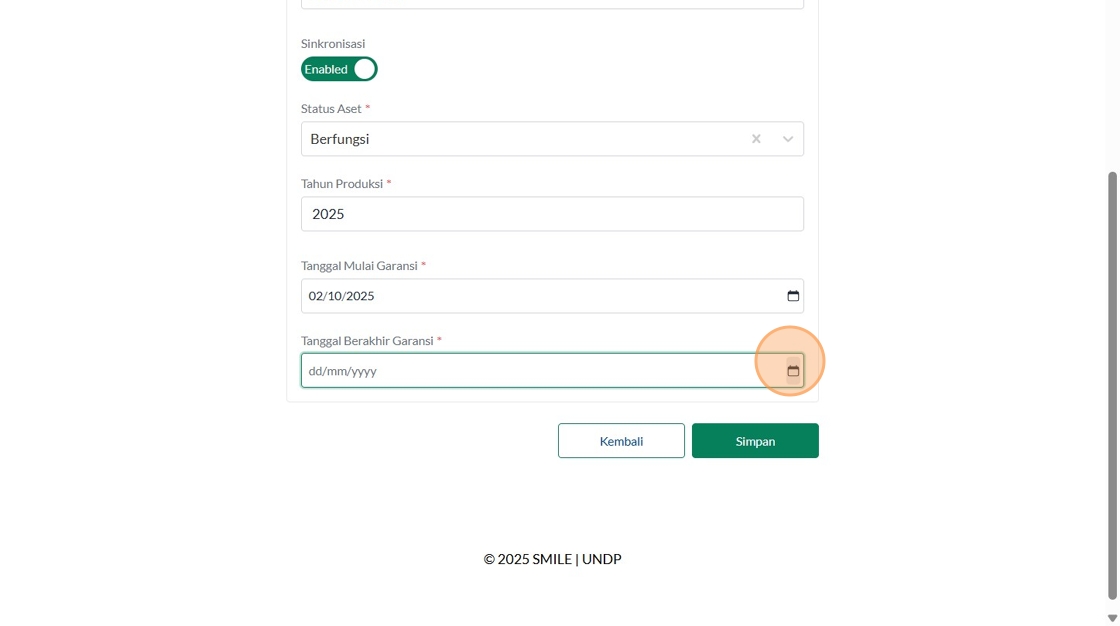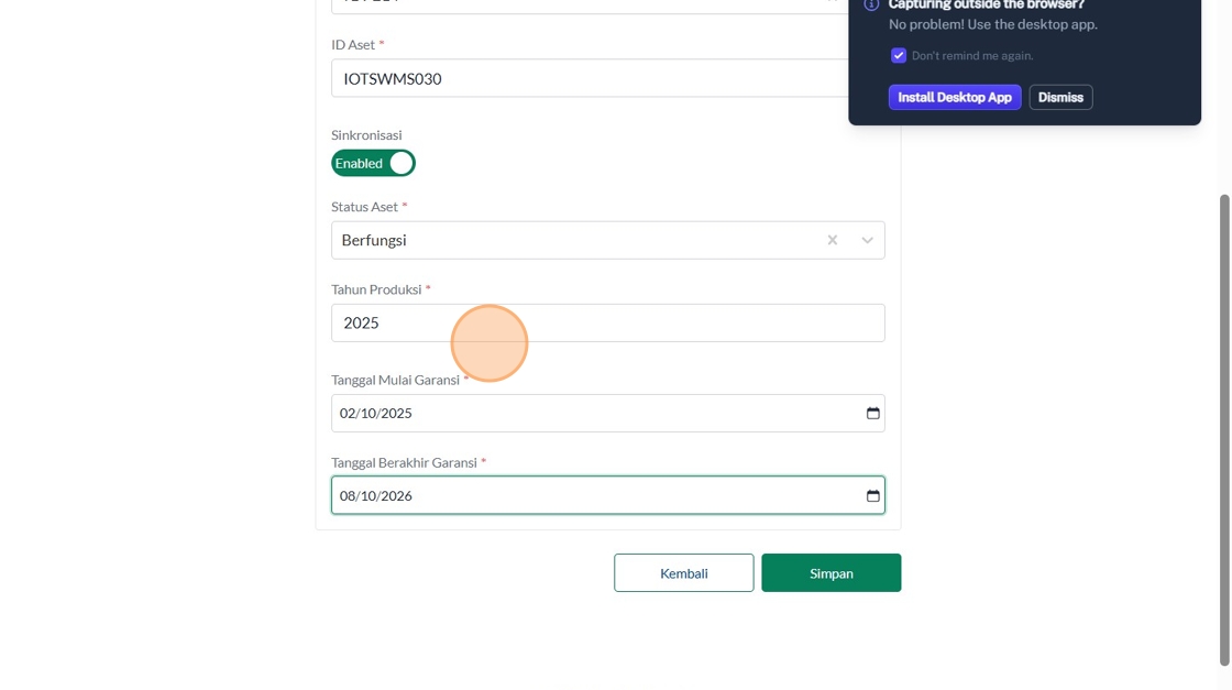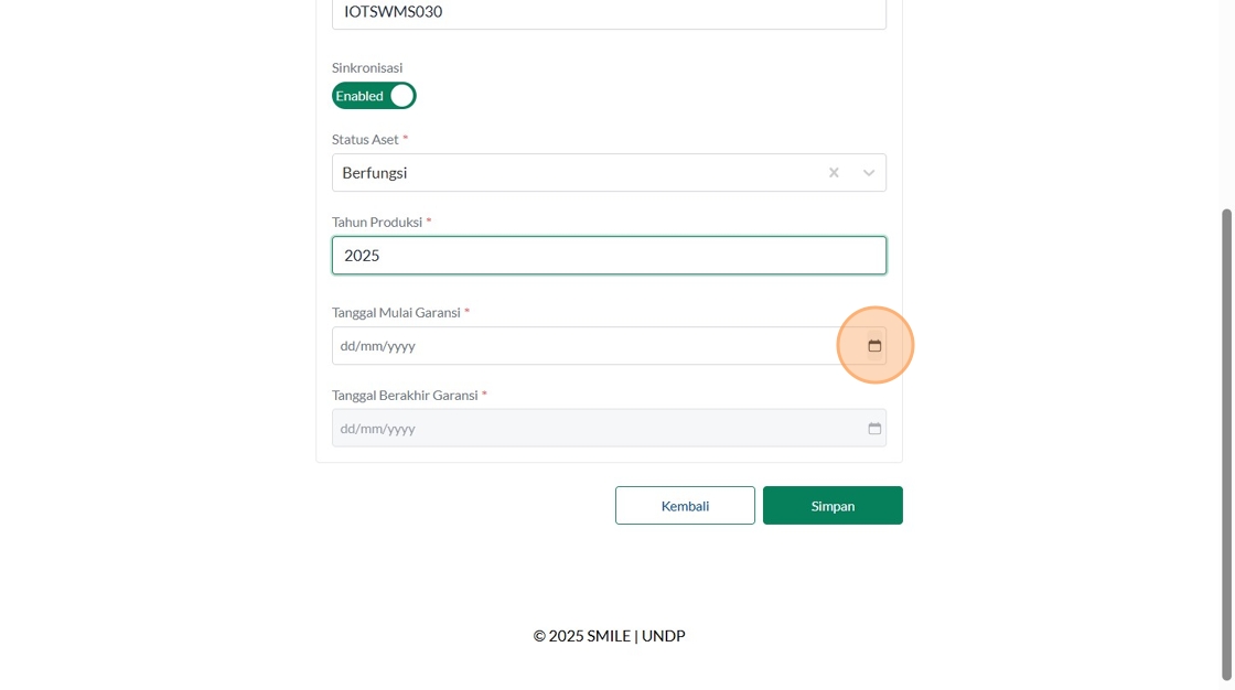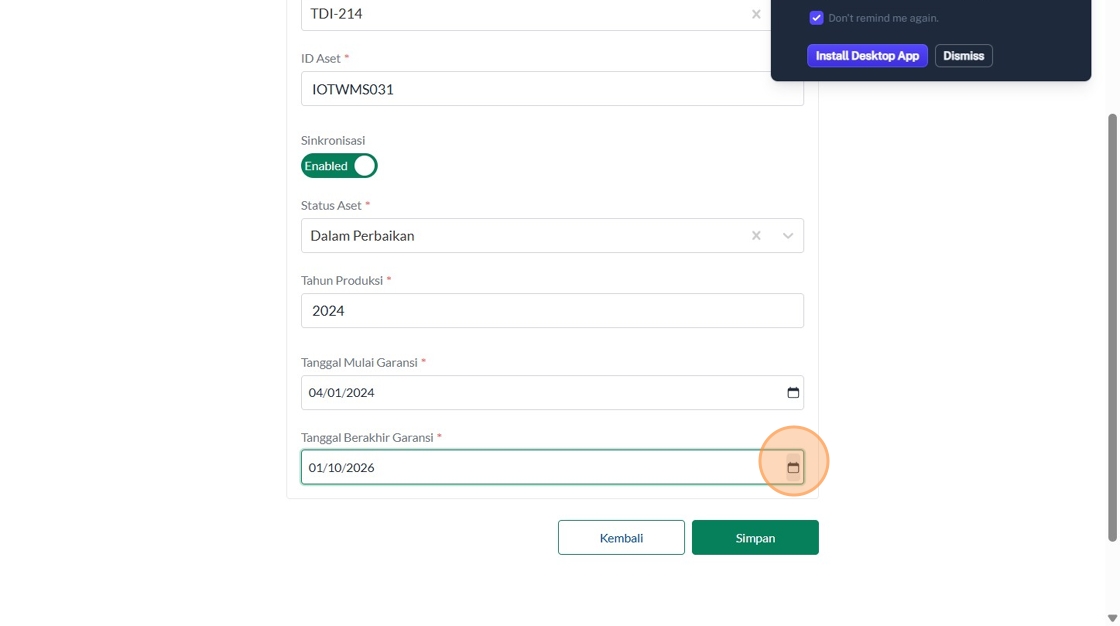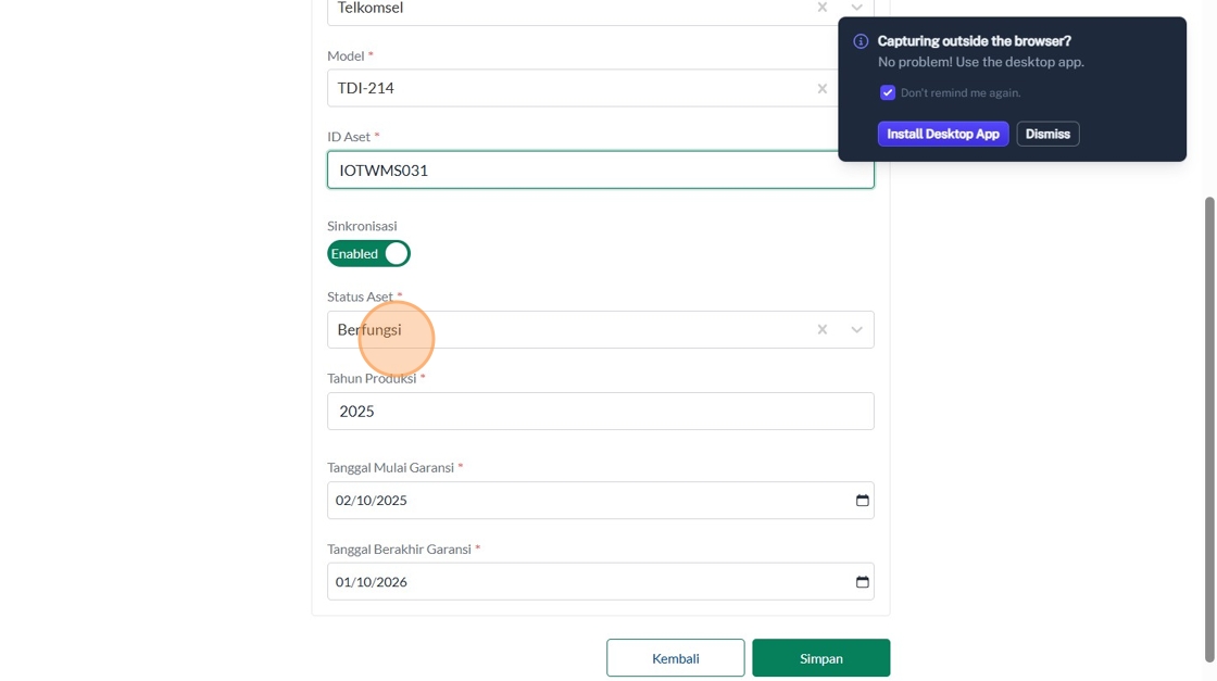 39. Click "Tipe AsetInsinerasiPabrikanVersaColdModelTest IncineratorID AsetSinkronisasiEnabledStatus AsetBerfungsiTahun ProduksiTanggal Mulai Garansi..."