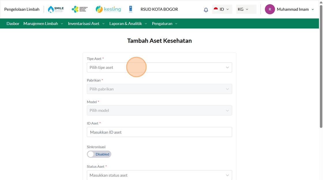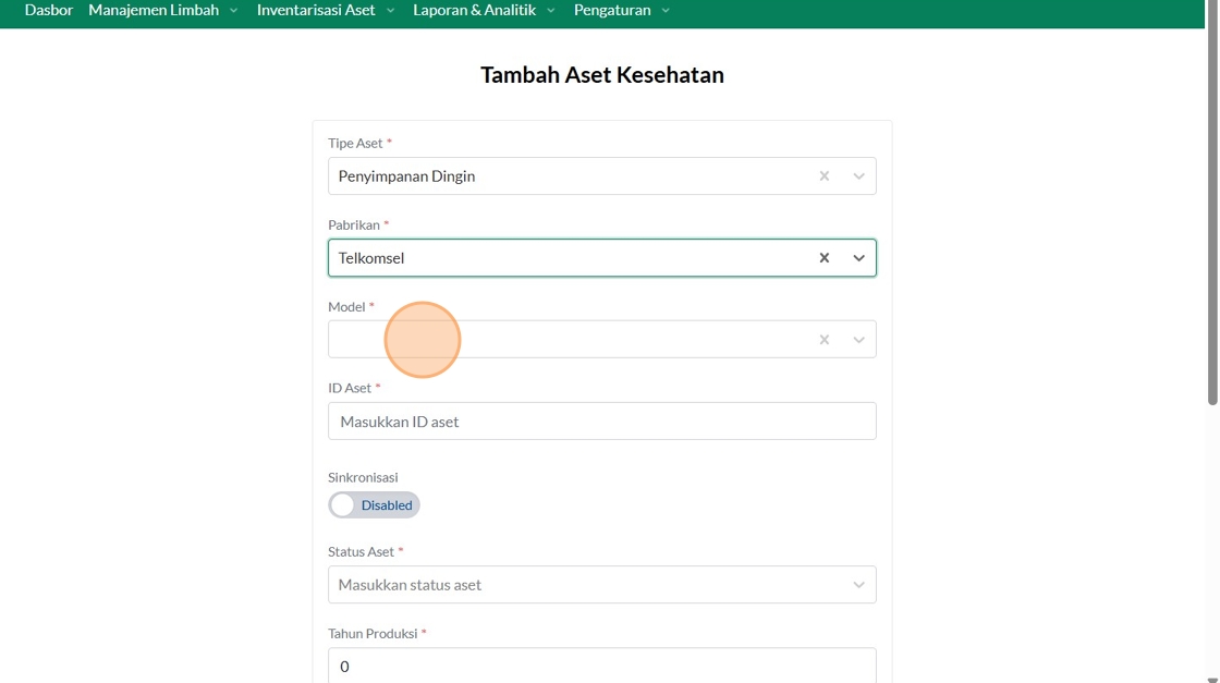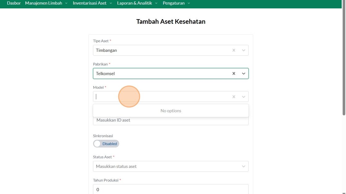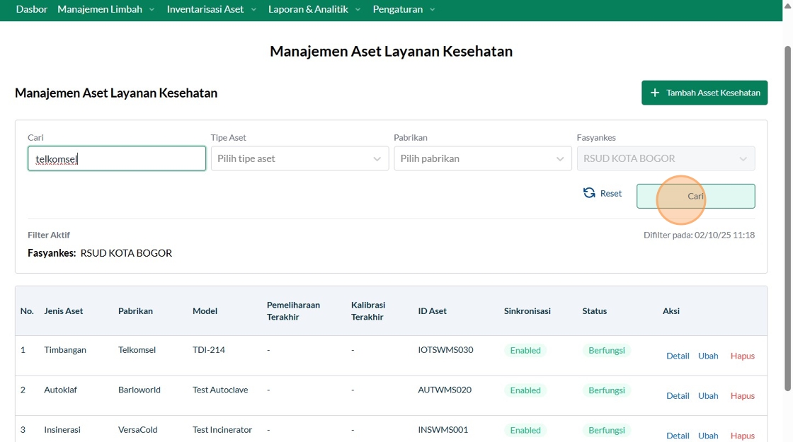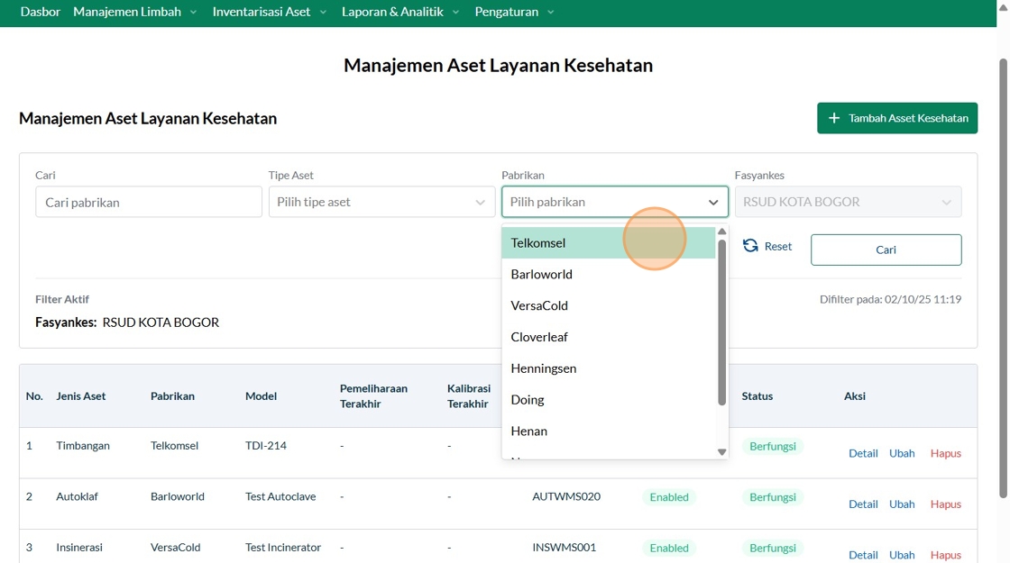 149. Click "Manajemen Aset Layanan KesehatanManajemen Aset Layanan KesehatanTambah Asset KesehatanCariTipe AsetPilih tipe asetPabrikanTelkomselFasyankesRSUD..."