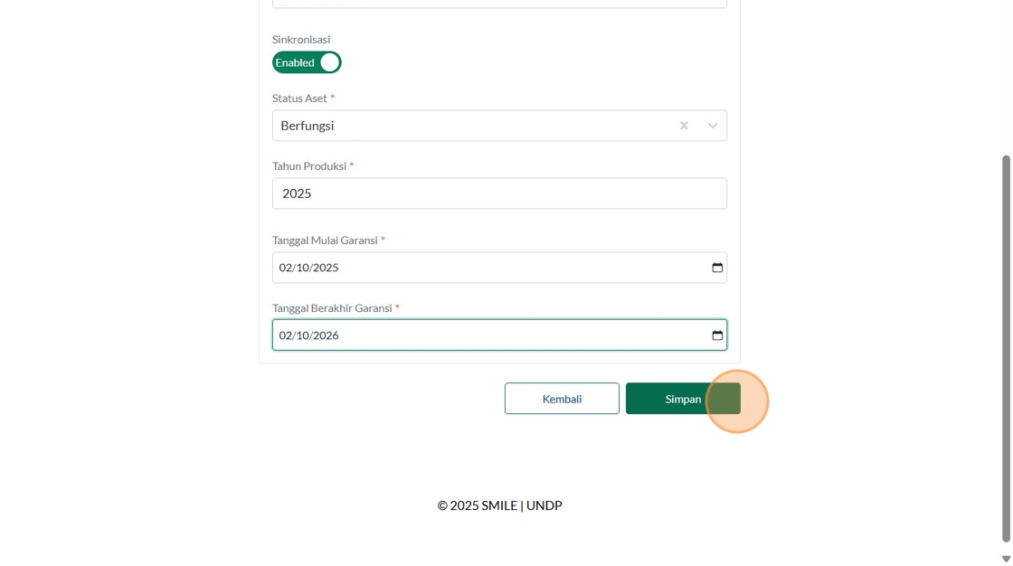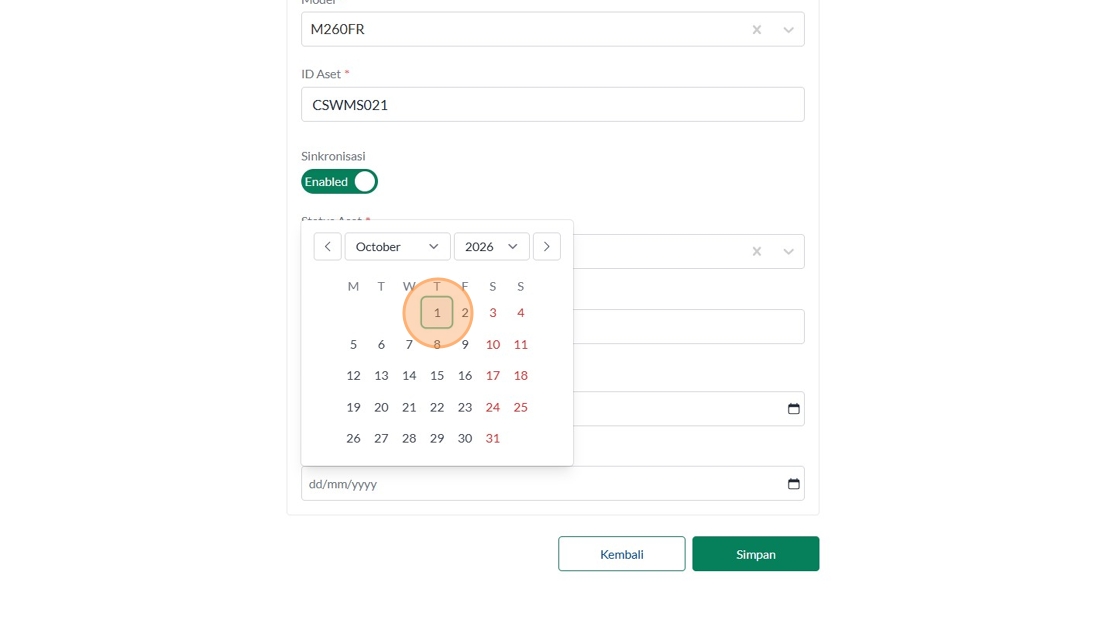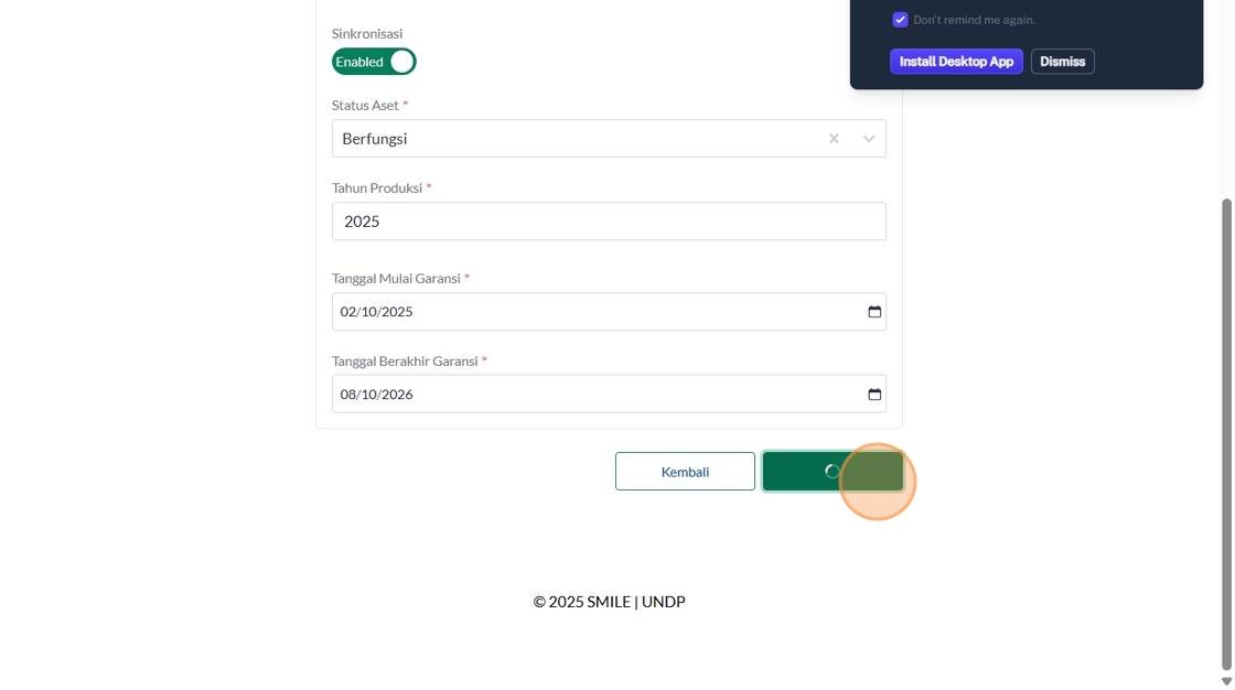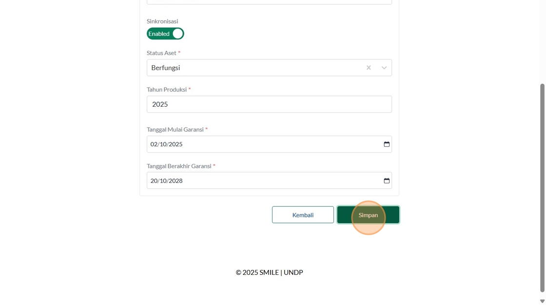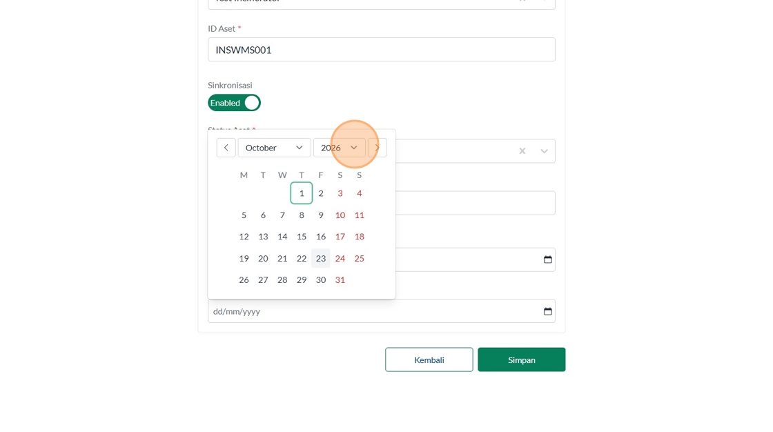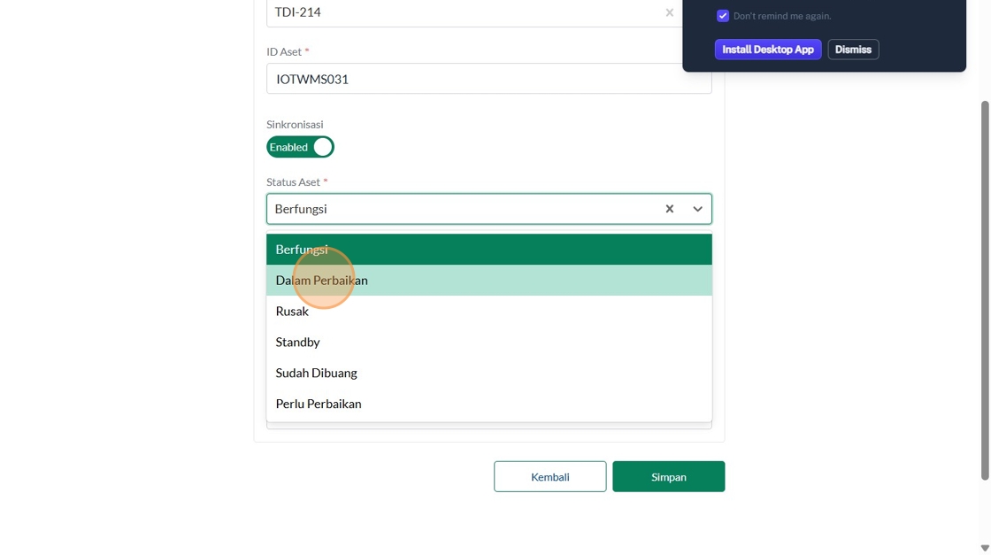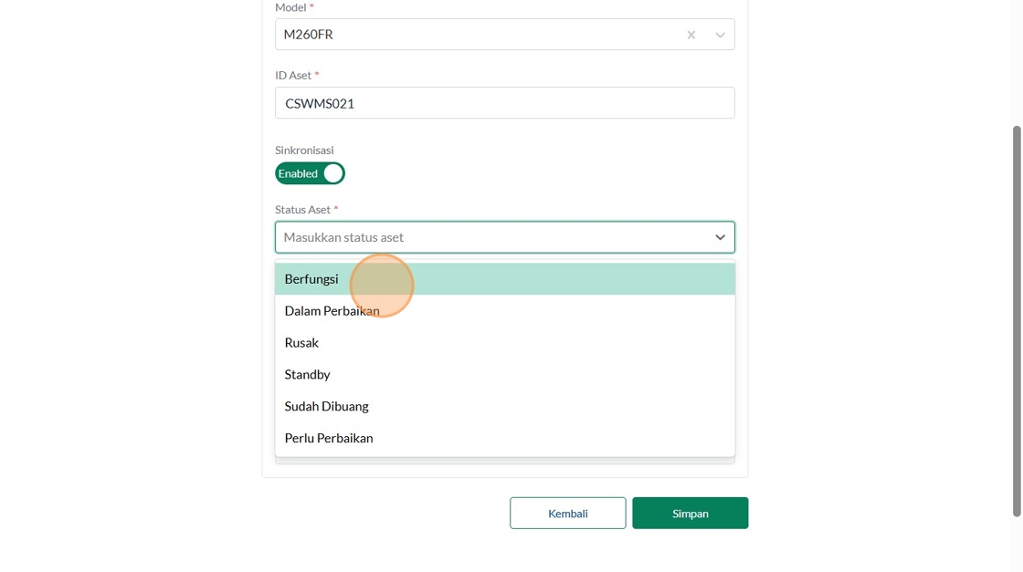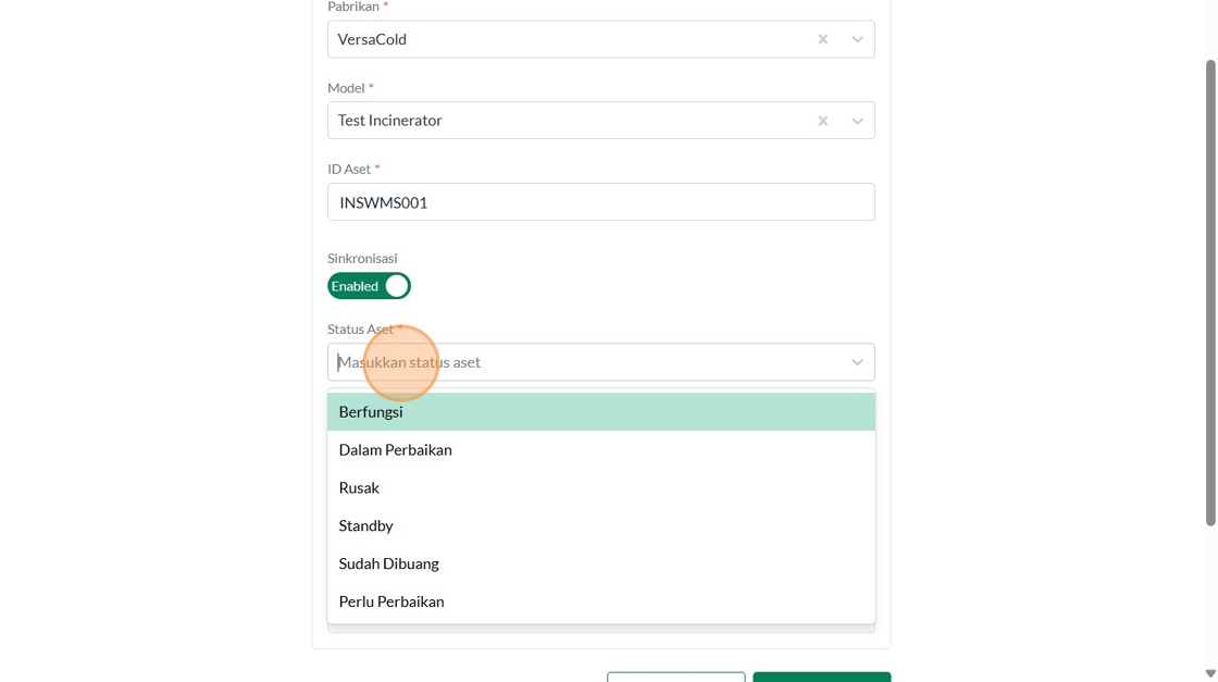 121. Click "Masukkan status aset"