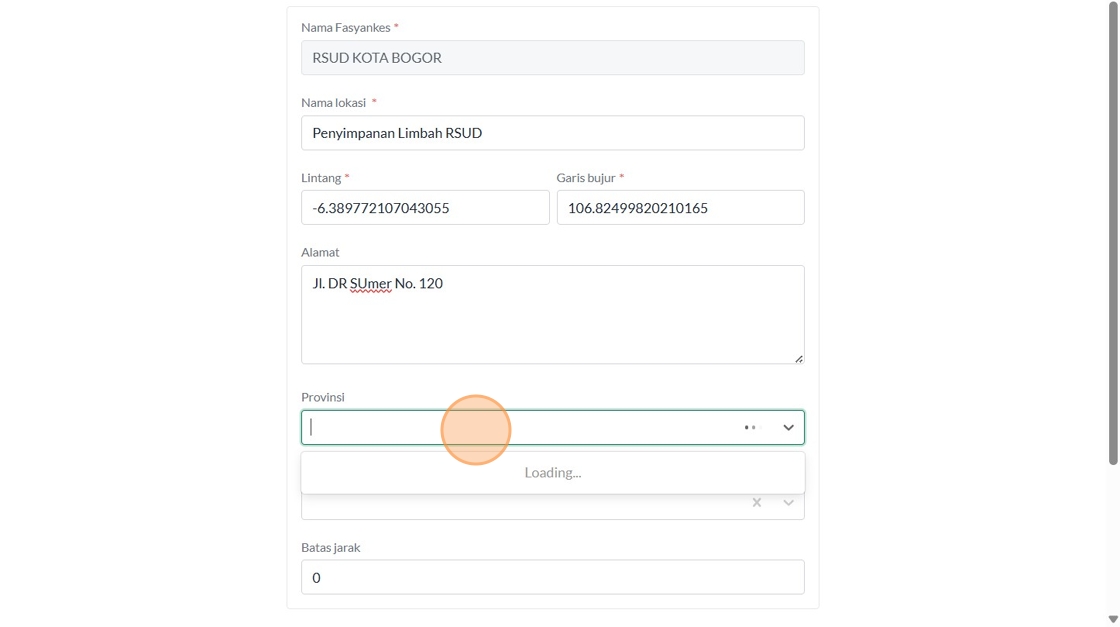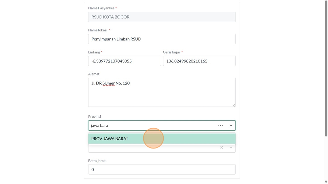 177. Click "Nama FasyankesNama lokasi LintangGaris bujurAlamatJl. DR SUmer No. 120ProvinsiPROV. JAWA BARATKabupaten/KotaKOTA BOGORBatas jarak Kembali"