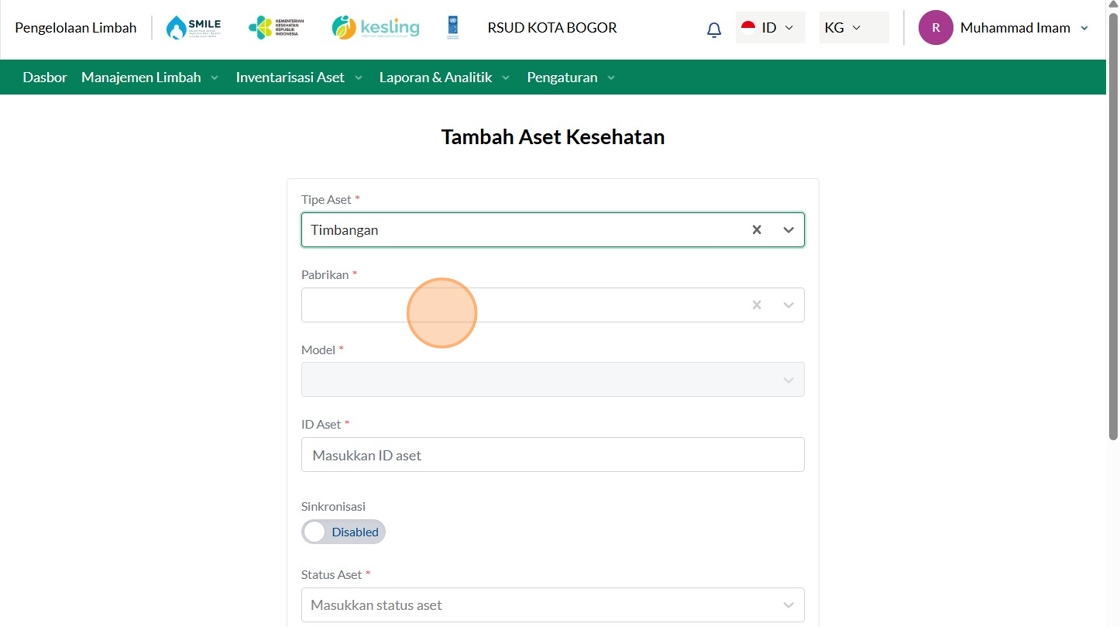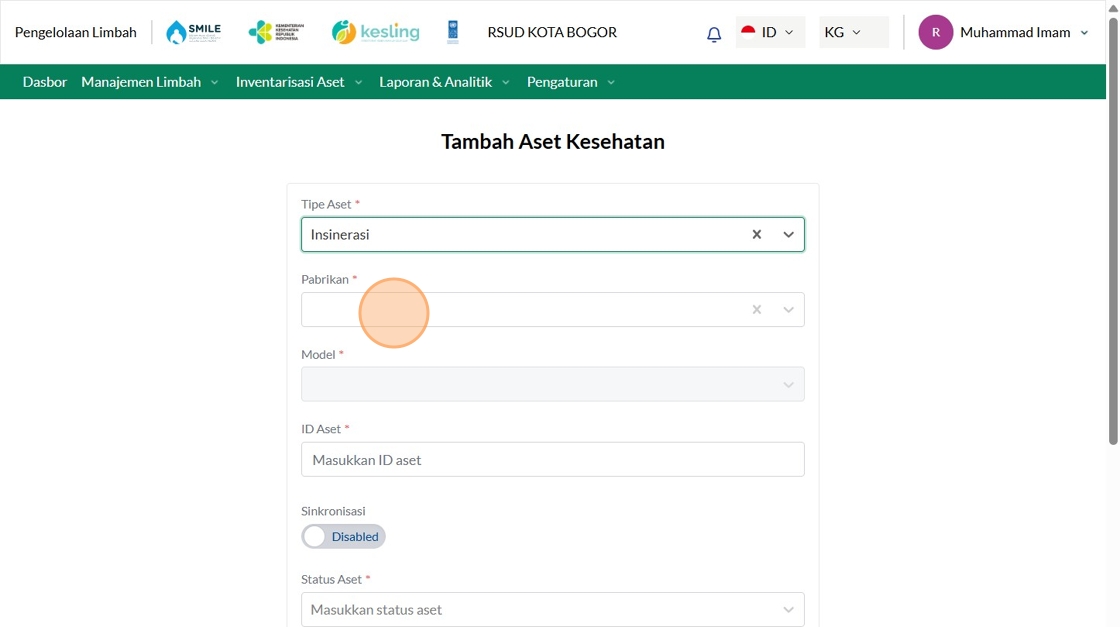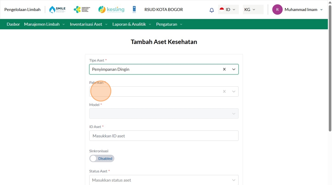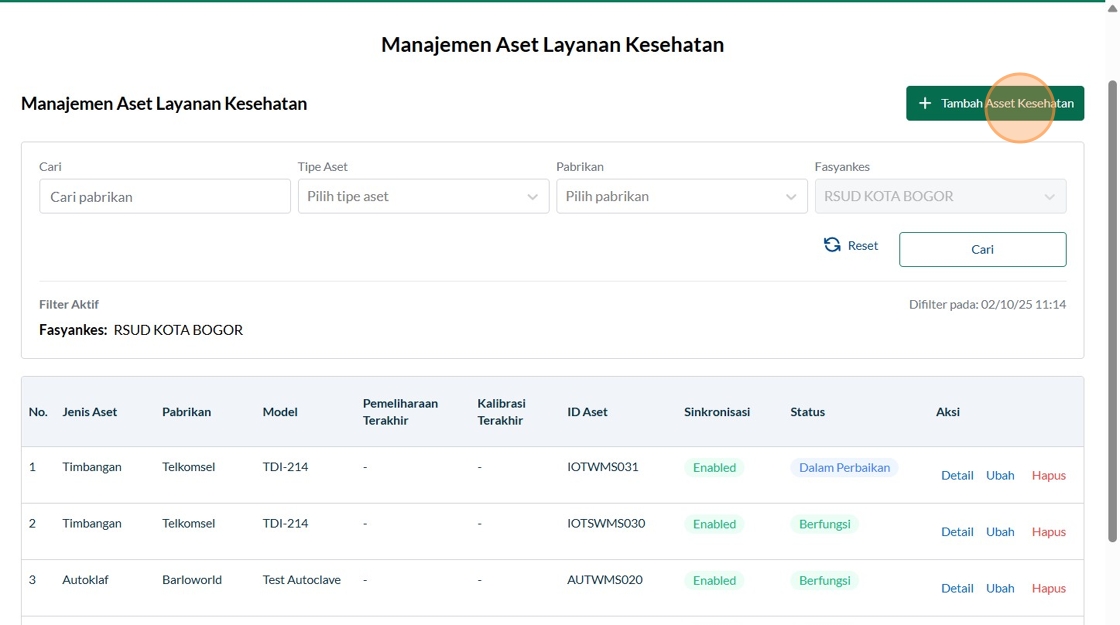 24. Click "Manajemen Aset Layanan KesehatanManajemen Aset Layanan KesehatanTambah Asset KesehatanCariTipe AsetPilih tipe asetPabrikanPilih pabrikanFasyanke..."