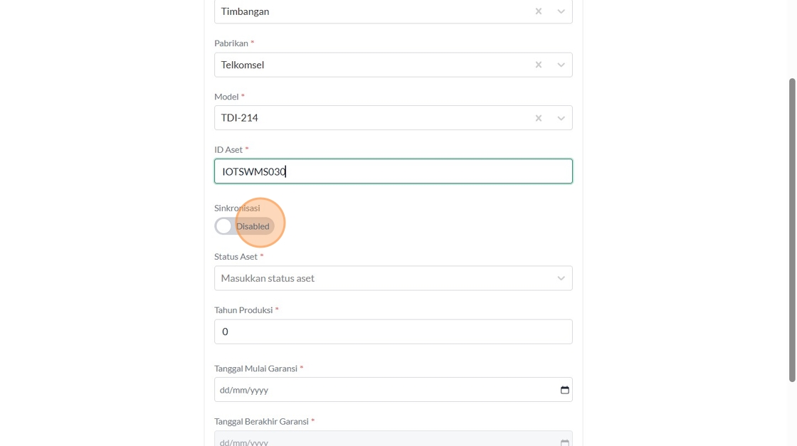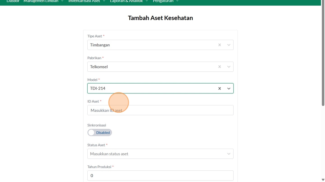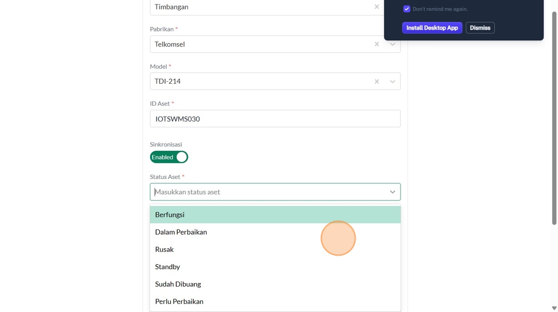 120. Click "Tipe AsetTimbanganPabrikanTelkomselModelTDI-214ID AsetSinkronisasiEnabledStatus Aset*6 results available.Use Up and Down to choose options, ..."