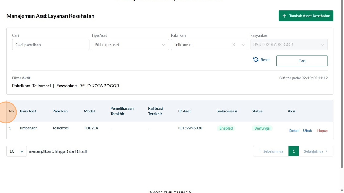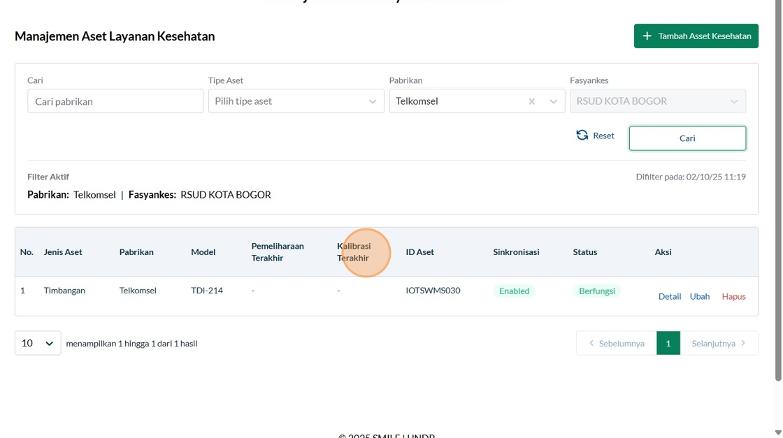 134. Click "KembaliAset KesehatanTentang Aset KesehatanFasyankes:RSUD KOTA BOGORJenis Aset:TimbanganPabrikan:TelkomselModel:TDI-214ID Aset:IOTSWMS030Sinkron..."