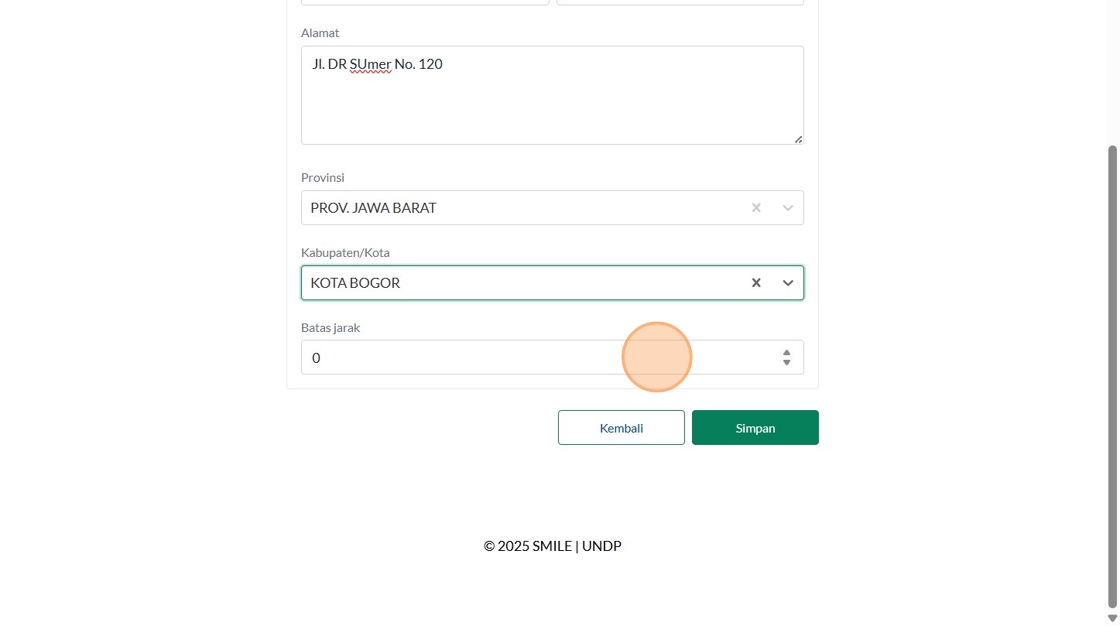 164. Click "Nama FasyankesNama lokasi LintangGaris bujurAlamatProvinsiKabupaten/KotaBatas jarak KembaliSimpan"