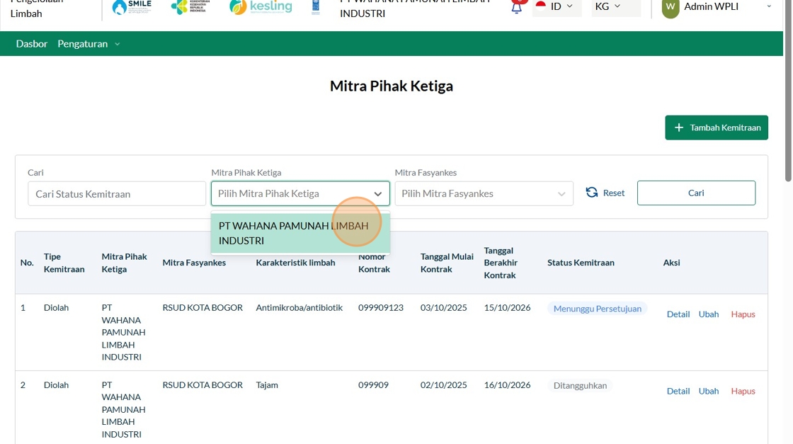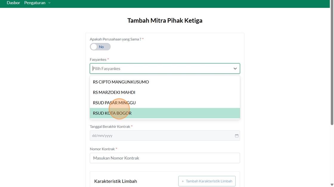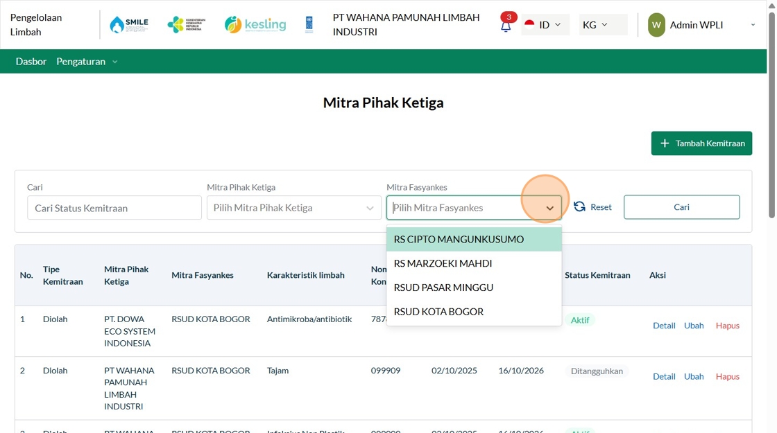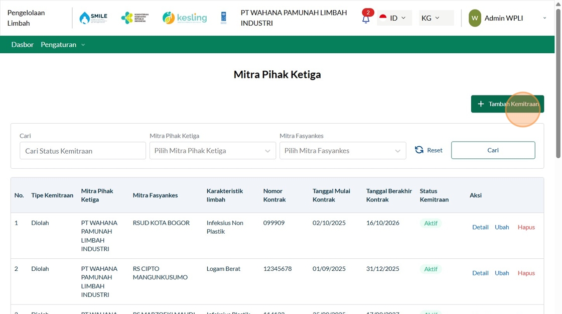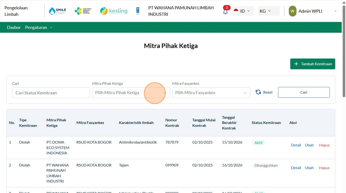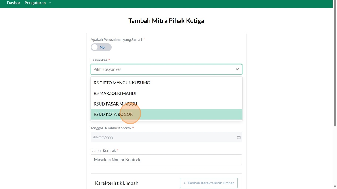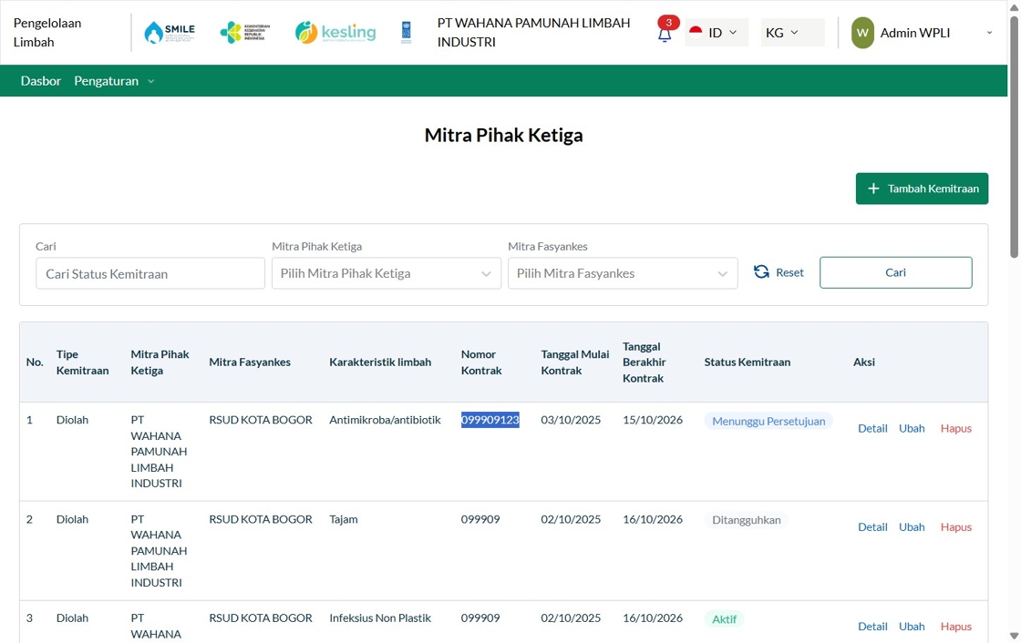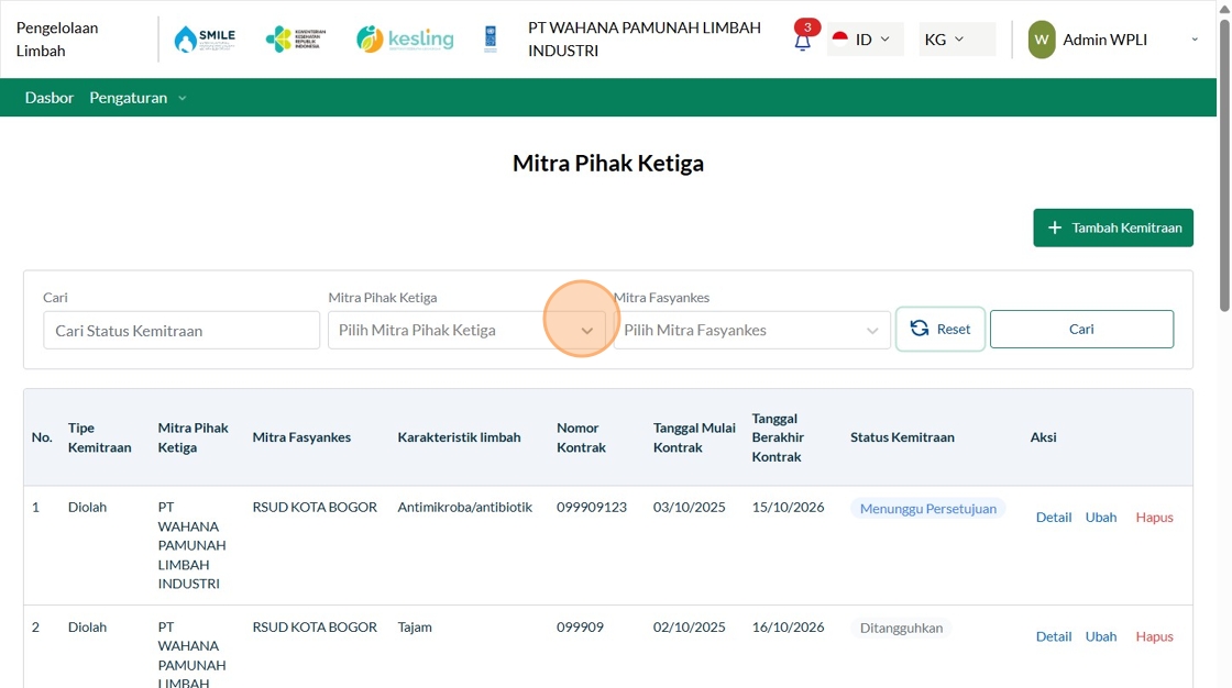 29. Click "Tambah Mitra Pihak KetigaApakah Perusahaan yang Sama ?NoFasyankesRSUD KOTA BOGORNama Perusahaan*PT WAHANA PAMUNAH LIMBAH INDUSTRITanggal Mulai..."