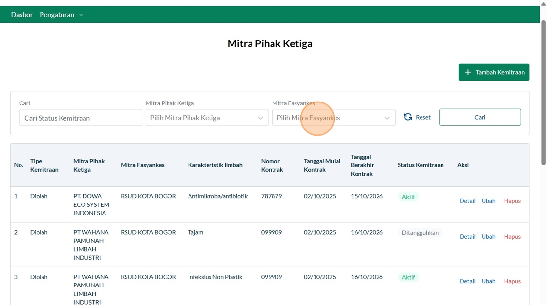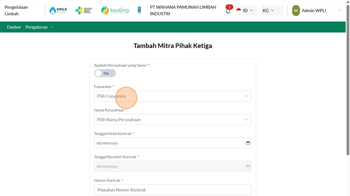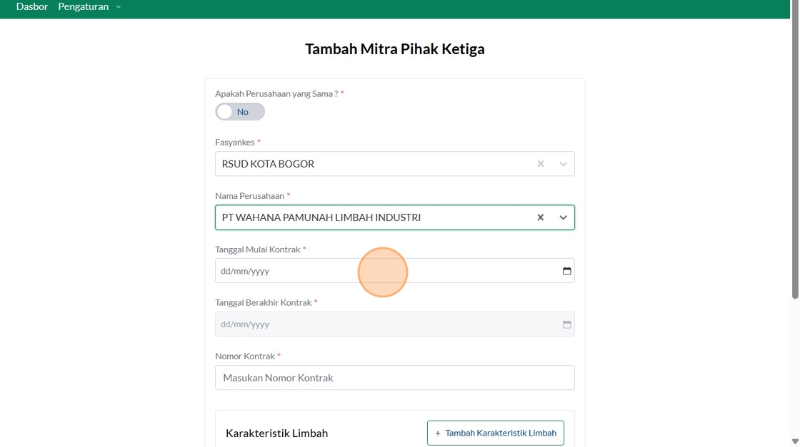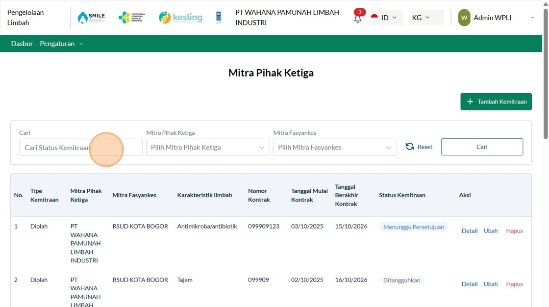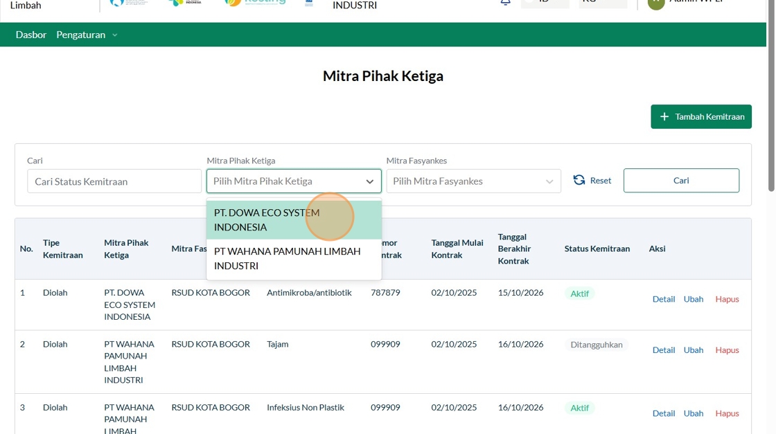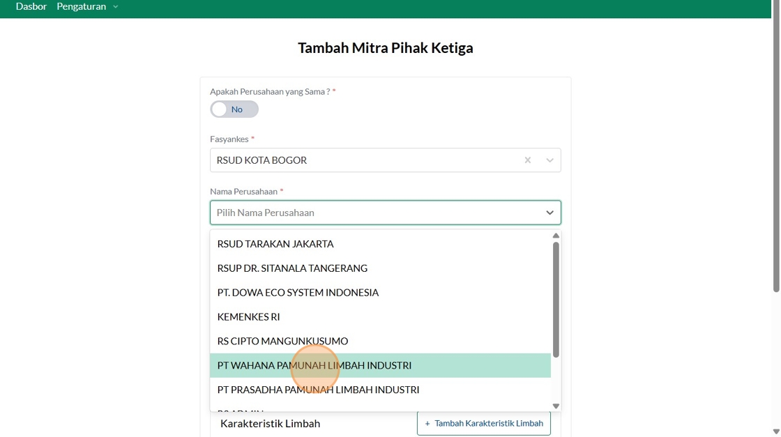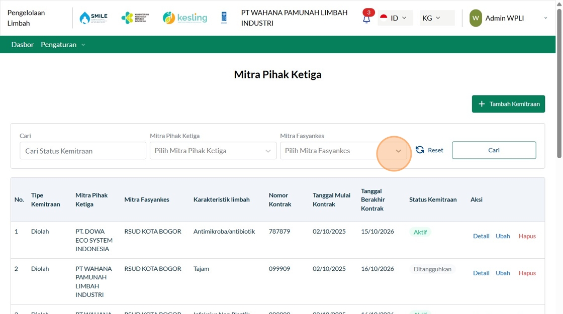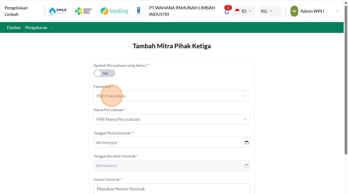 29. Click "Tambah Mitra Pihak KetigaApakah Perusahaan yang Sama ?NoFasyankesRSUD KOTA BOGORNama Perusahaan*PT WAHANA PAMUNAH LIMBAH INDUSTRITanggal Mulai..."