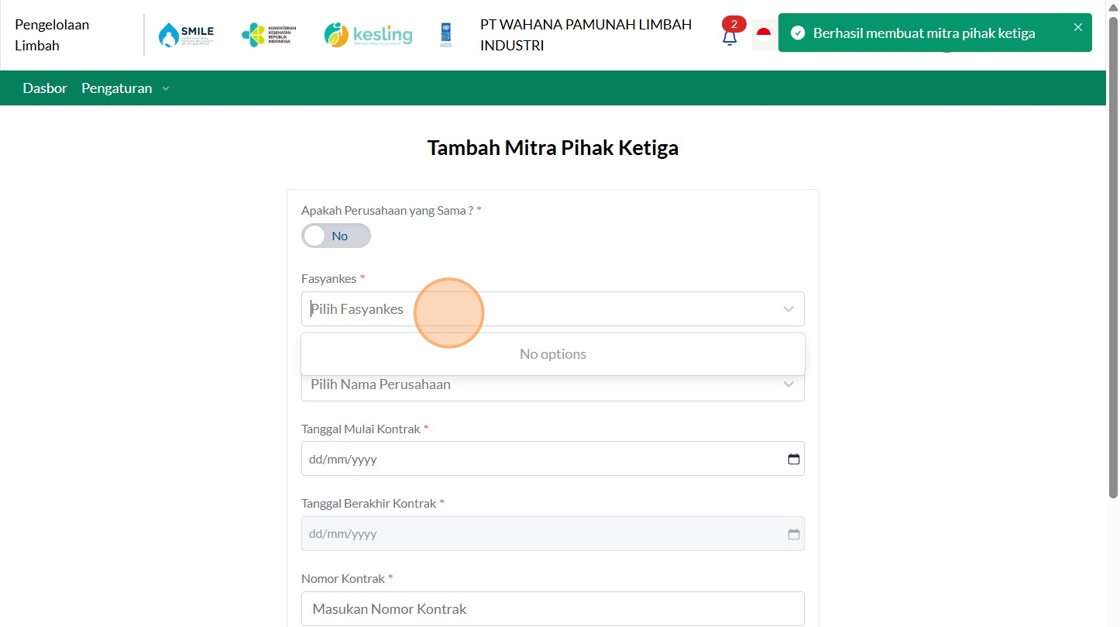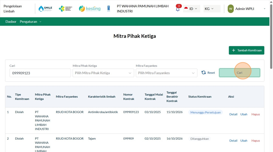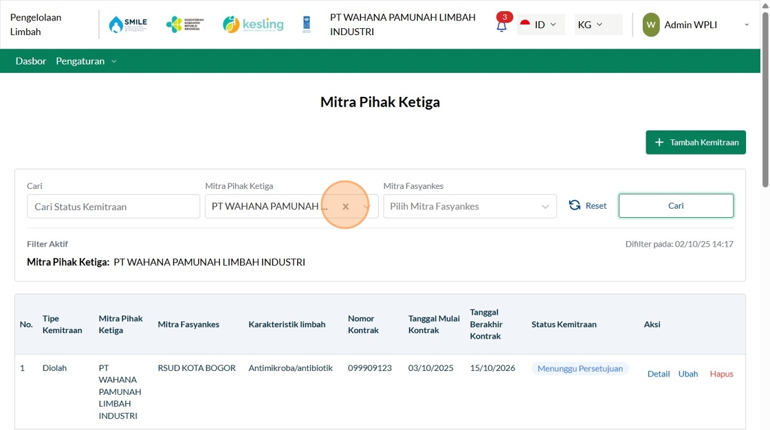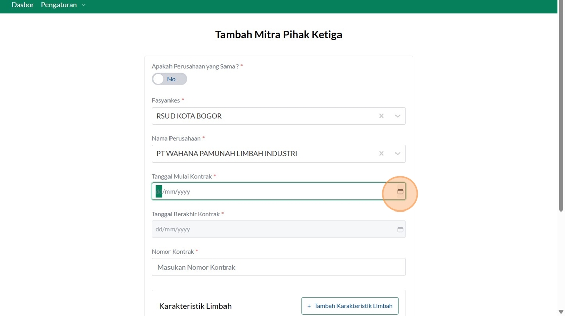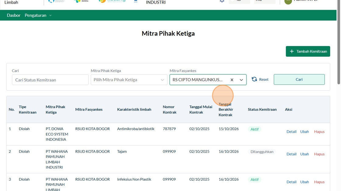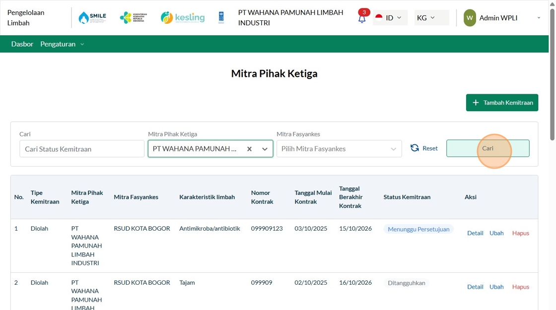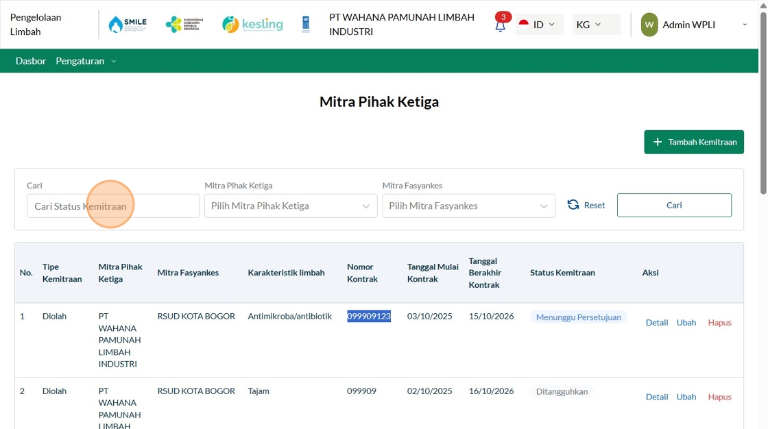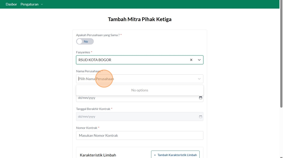 29. Click "Tambah Mitra Pihak KetigaApakah Perusahaan yang Sama ?NoFasyankesRSUD KOTA BOGORNama Perusahaan*PT WAHANA PAMUNAH LIMBAH INDUSTRITanggal Mulai..."