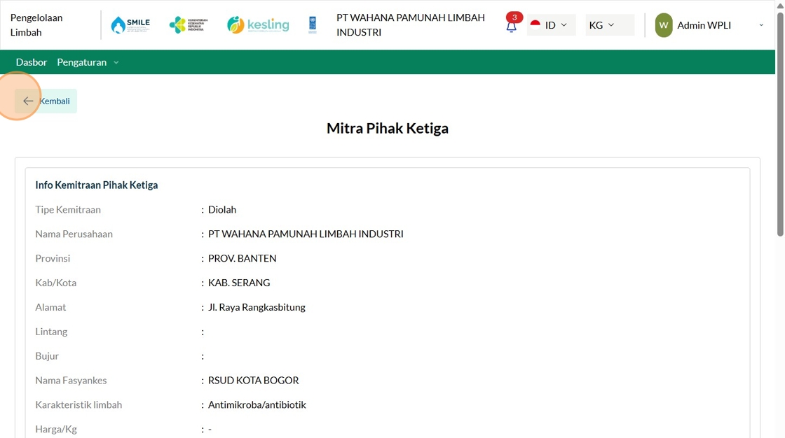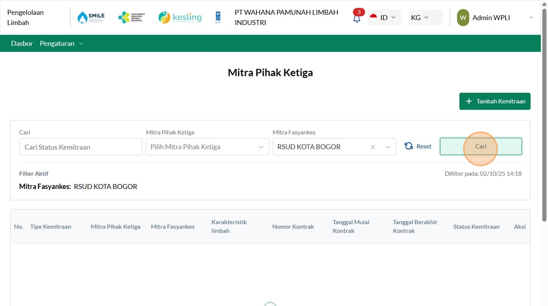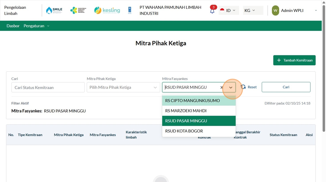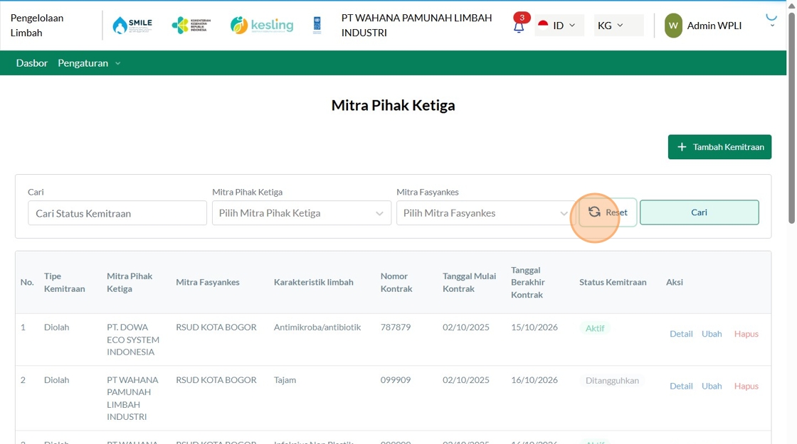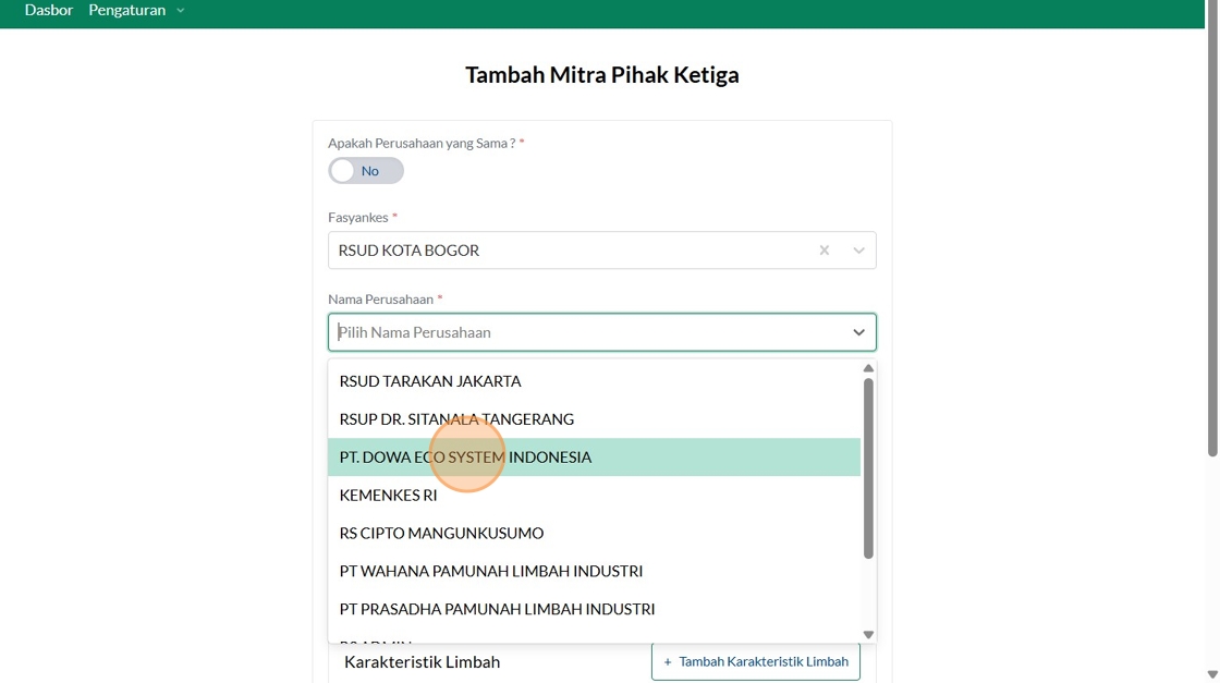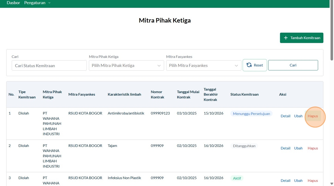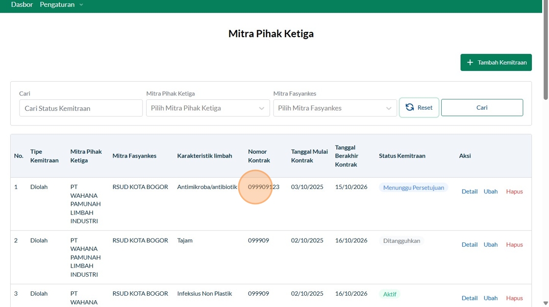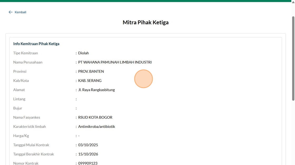 29. Click "Tambah Mitra Pihak KetigaApakah Perusahaan yang Sama ?NoFasyankesRSUD KOTA BOGORNama Perusahaan*PT WAHANA PAMUNAH LIMBAH INDUSTRITanggal Mulai..."