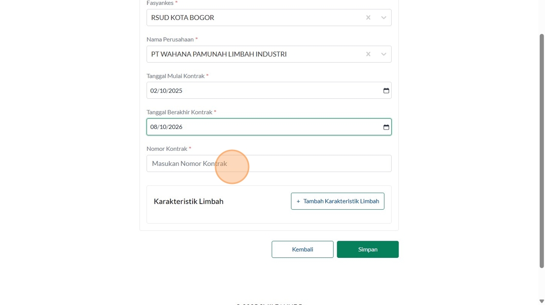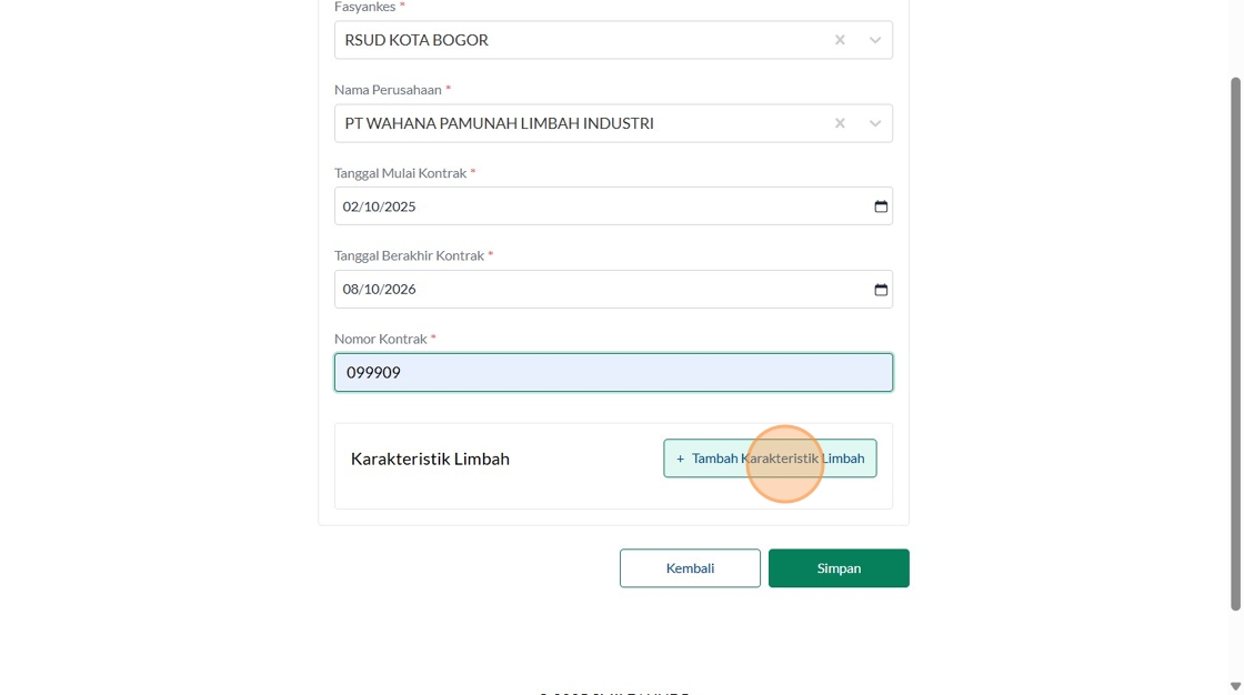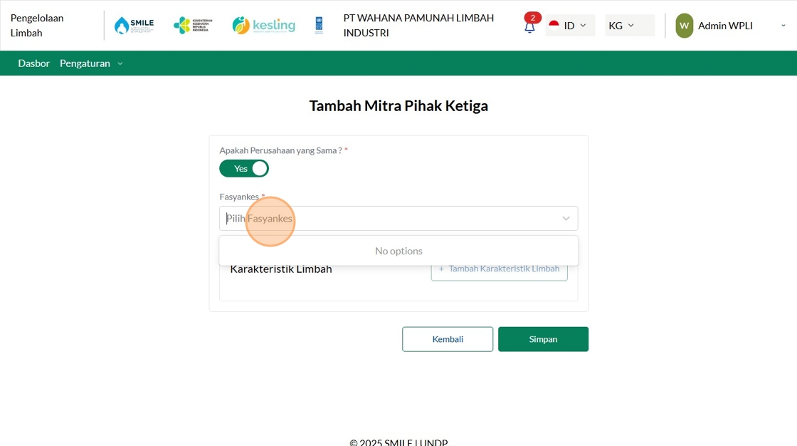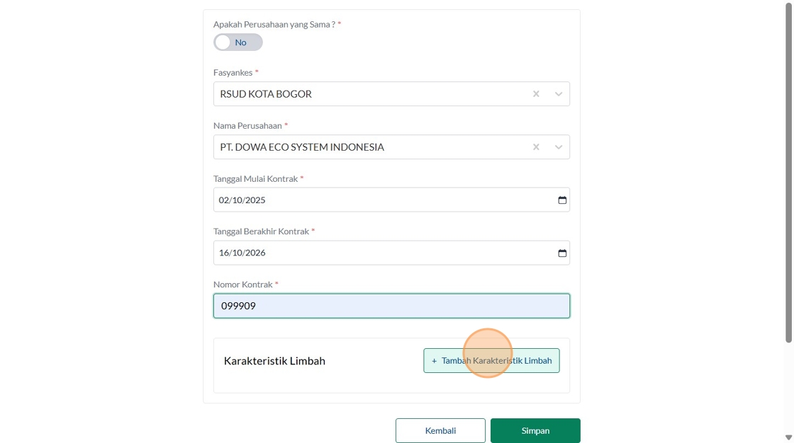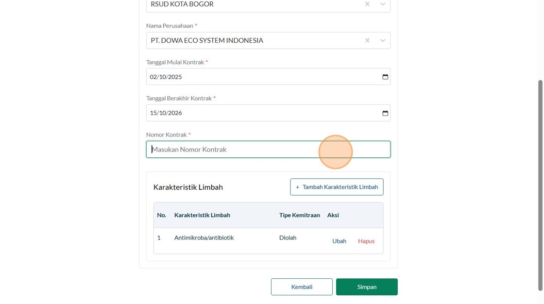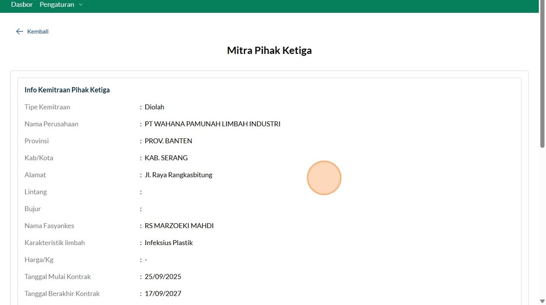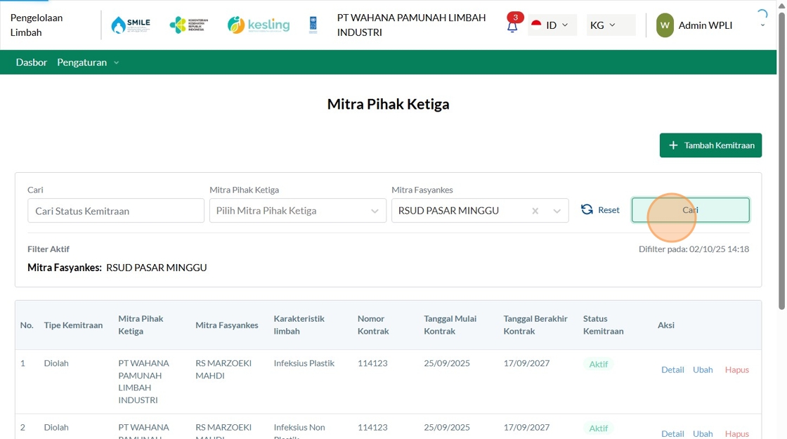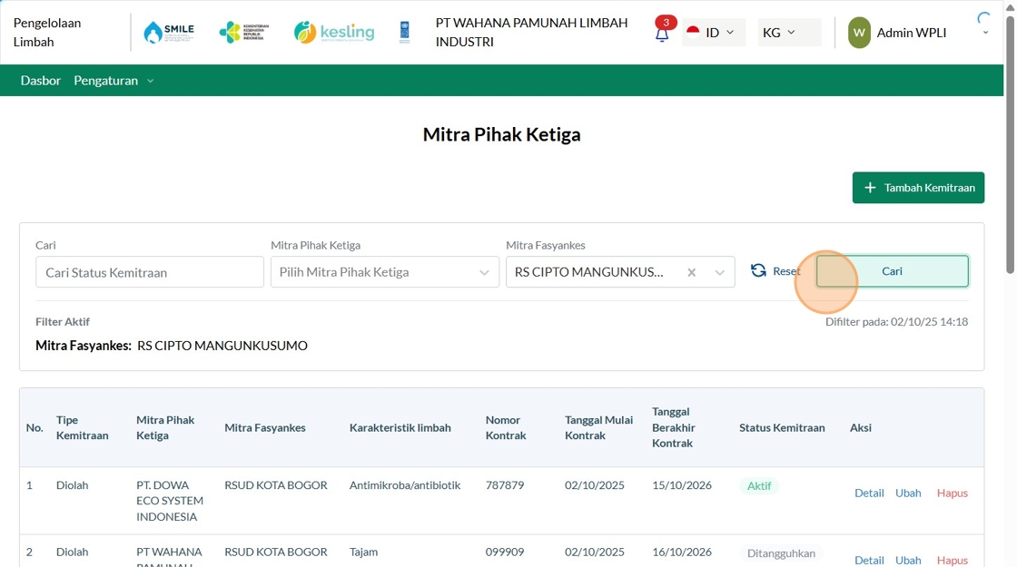 29. Click "Tambah Mitra Pihak KetigaApakah Perusahaan yang Sama ?NoFasyankesRSUD KOTA BOGORNama Perusahaan*PT WAHANA PAMUNAH LIMBAH INDUSTRITanggal Mulai..."
