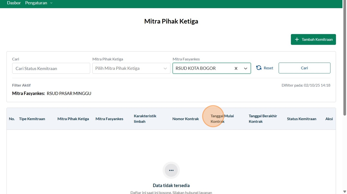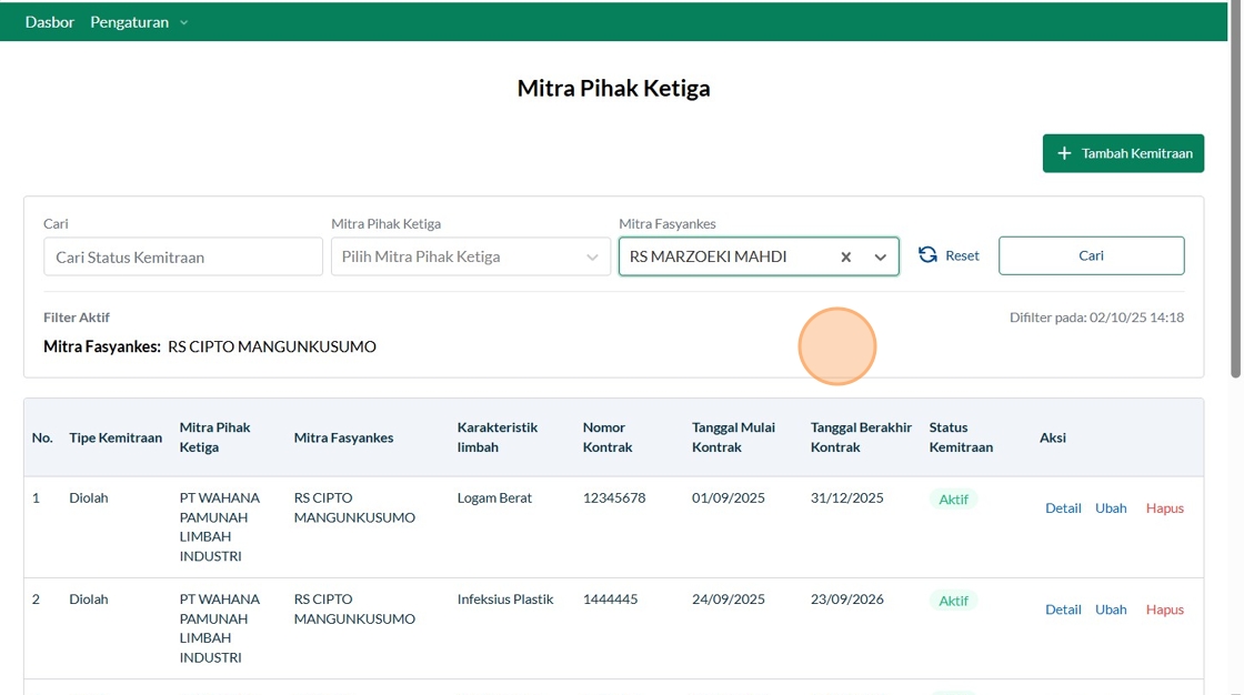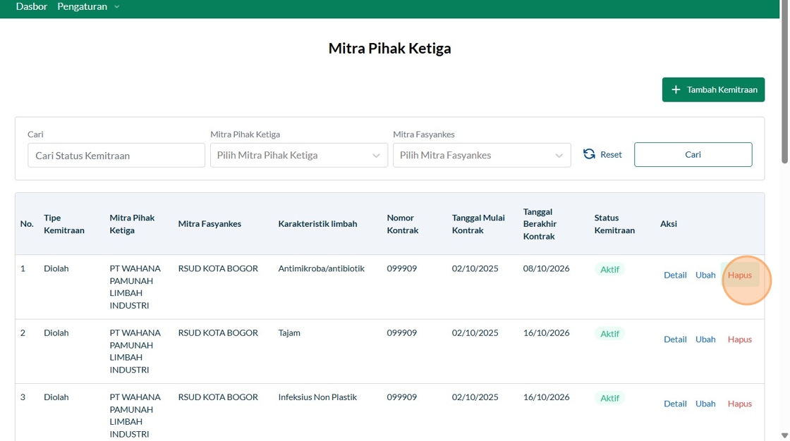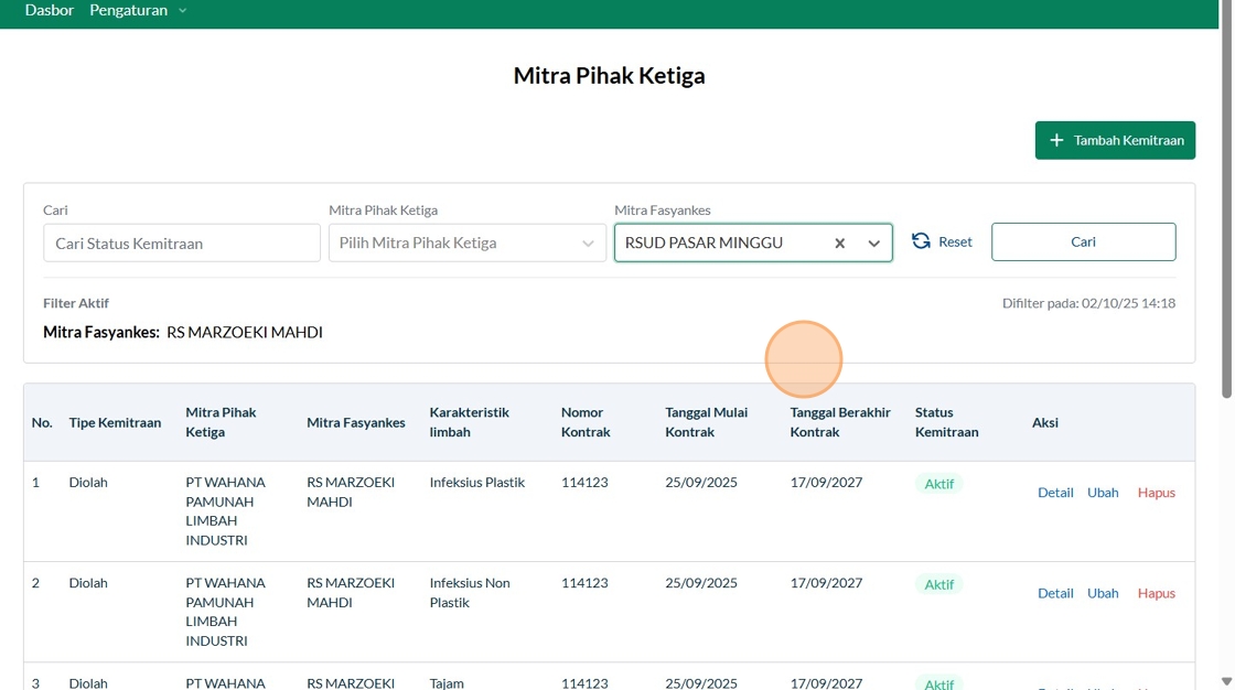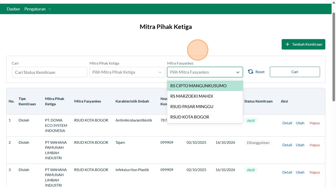 143. Click "Tambah KemitraanCariMitra Pihak KetigaPilih Mitra Pihak KetigaMitra FasyankesPilih Mitra FasyankesResetCariNo.Tipe KemitraanMitra Pihak KetigaMi..."