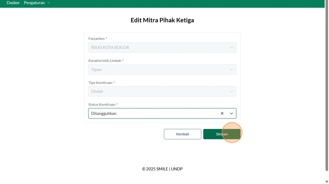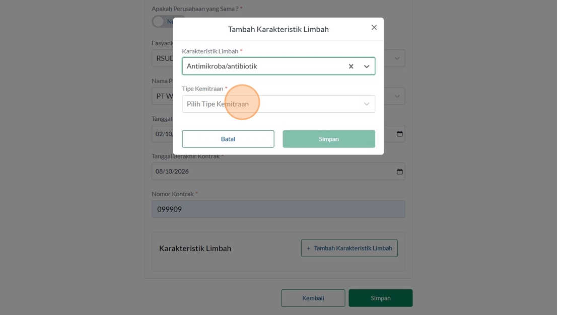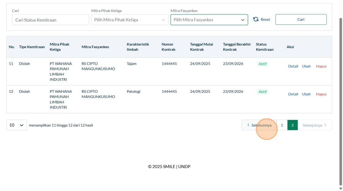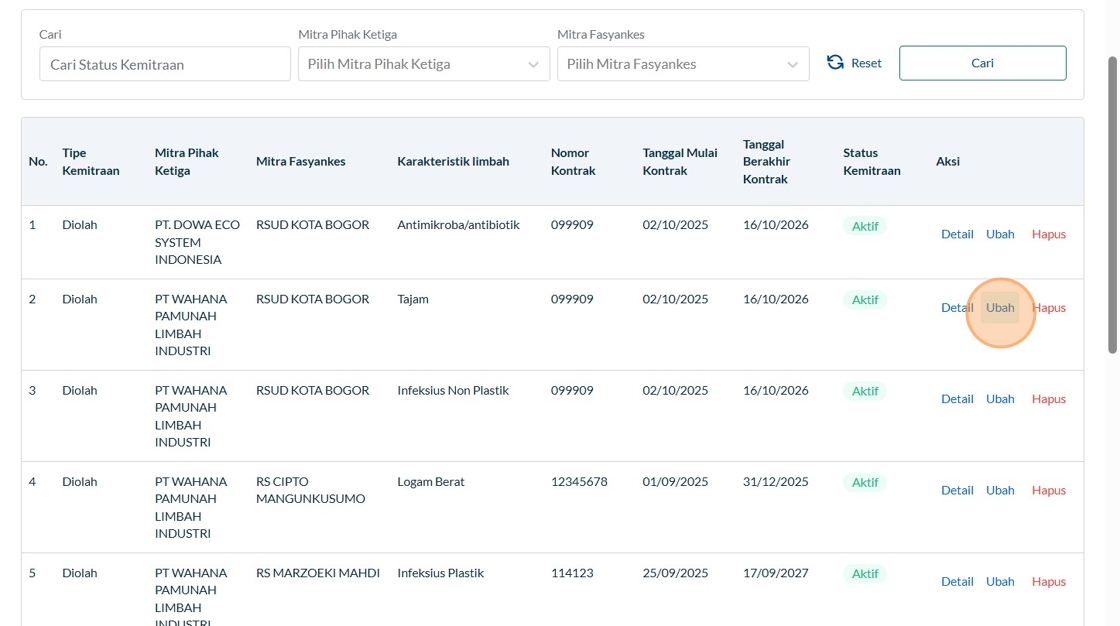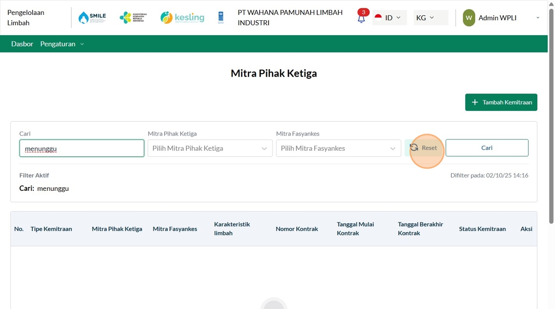 143. Click "Tambah KemitraanCariMitra Pihak KetigaPilih Mitra Pihak KetigaMitra FasyankesPilih Mitra FasyankesResetCariNo.Tipe KemitraanMitra Pihak KetigaMi..."