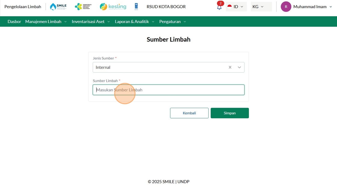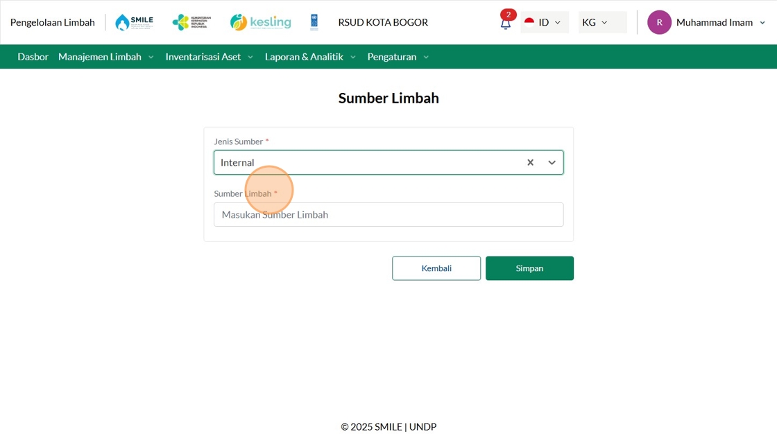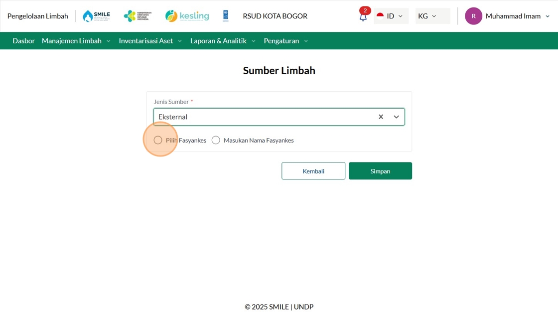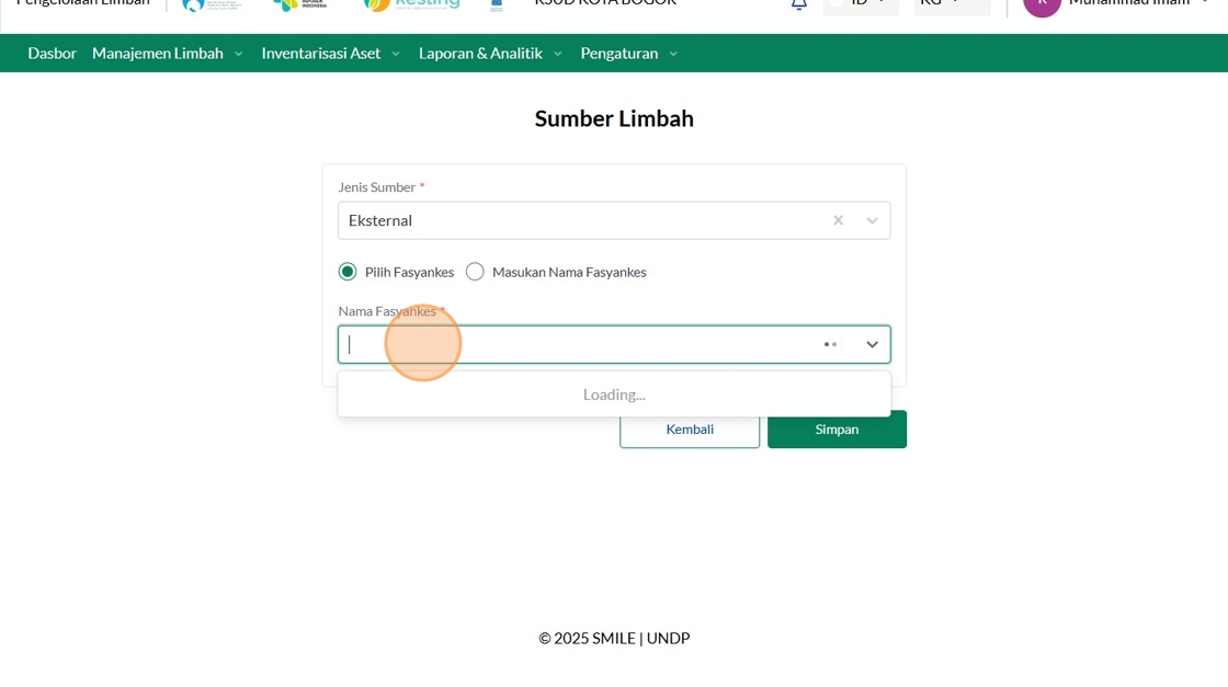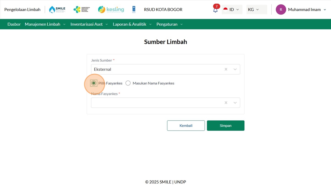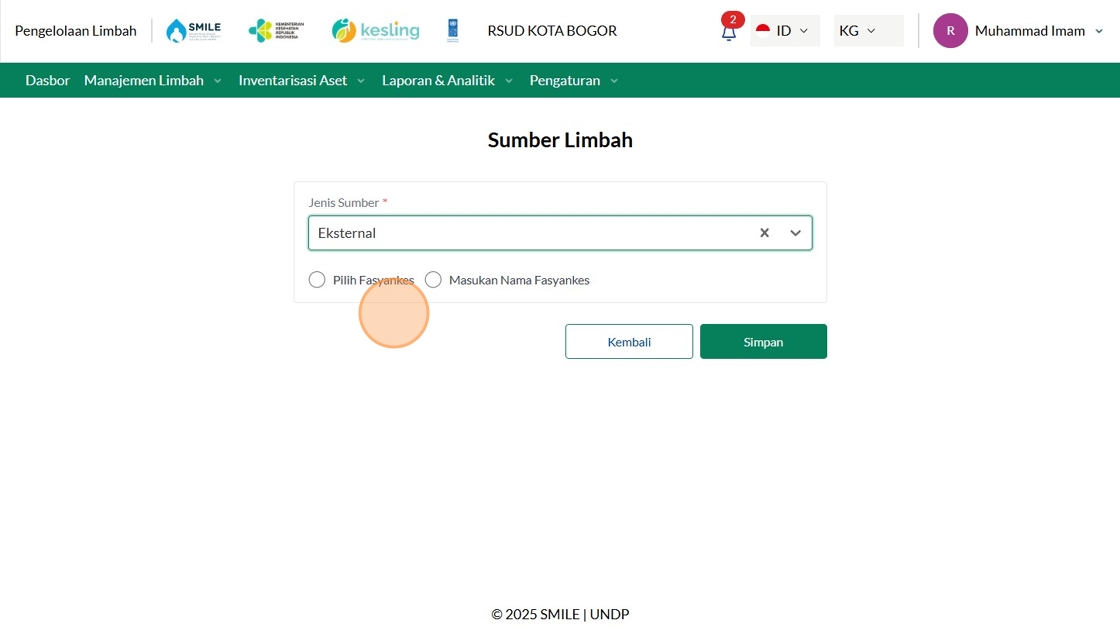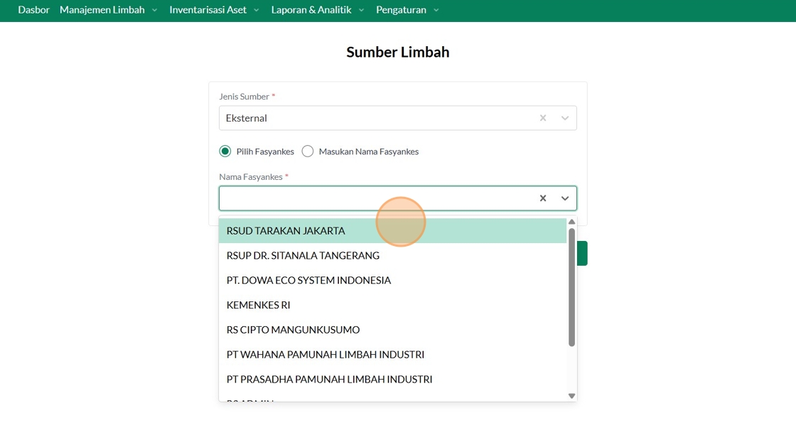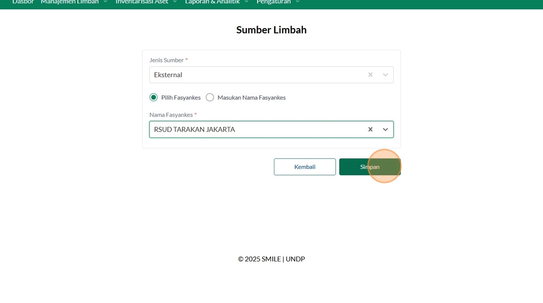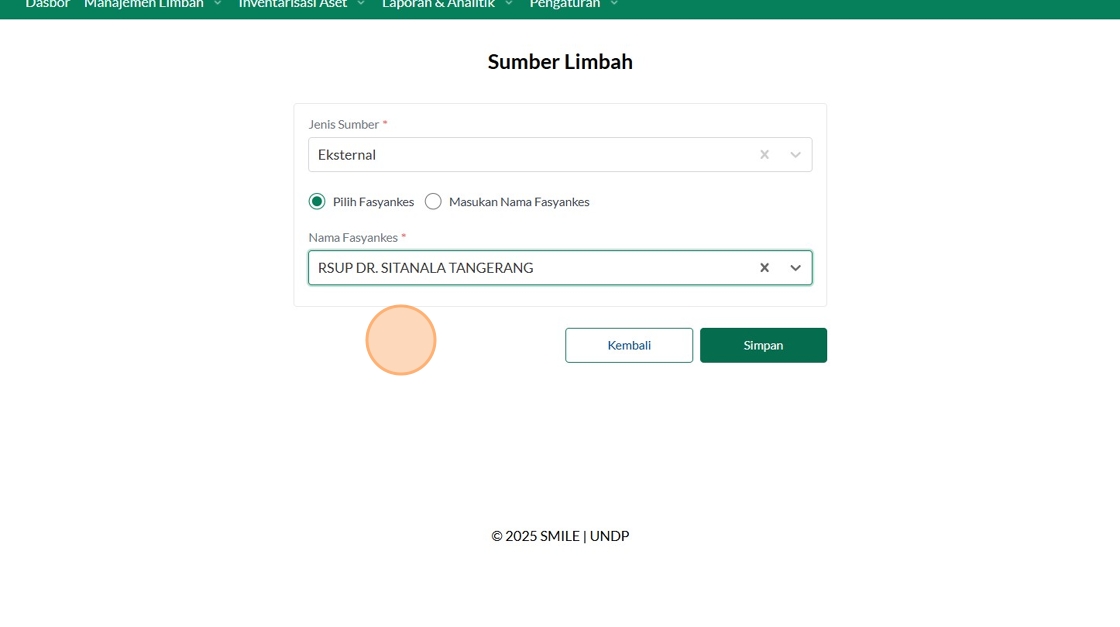 21. Click "Sumber LimbahJenis SumberEksternalPilih FasyankesMasukan Nama FasyankesNama FasyankesKembaliSimpan"