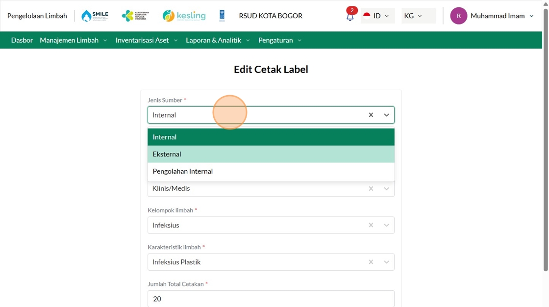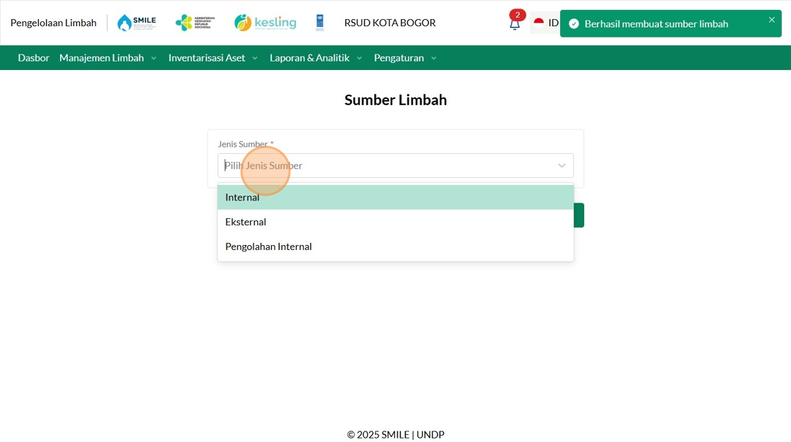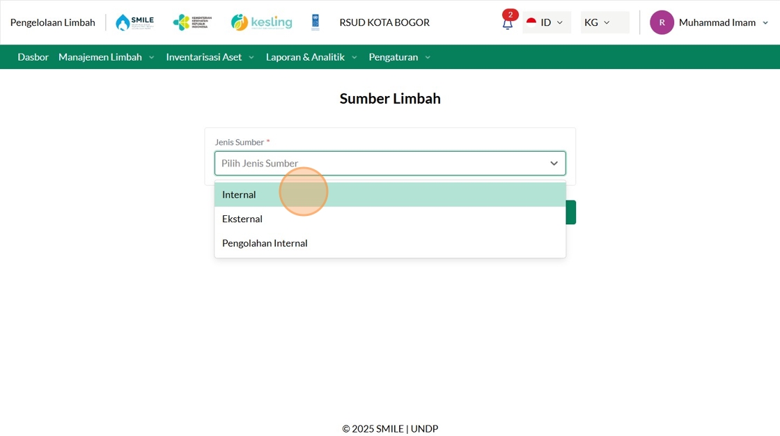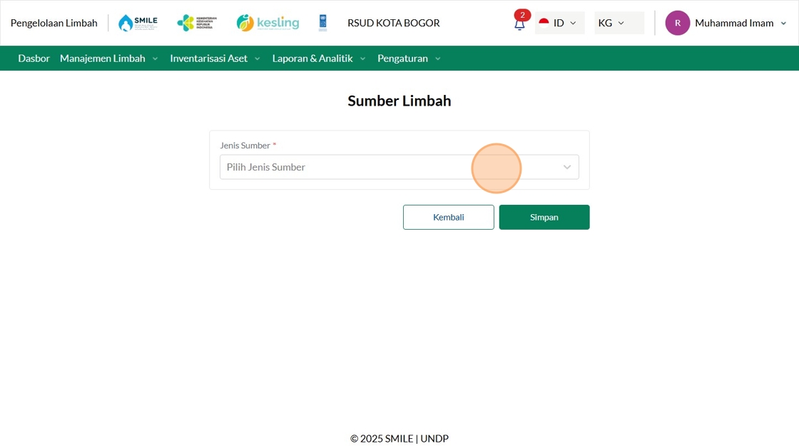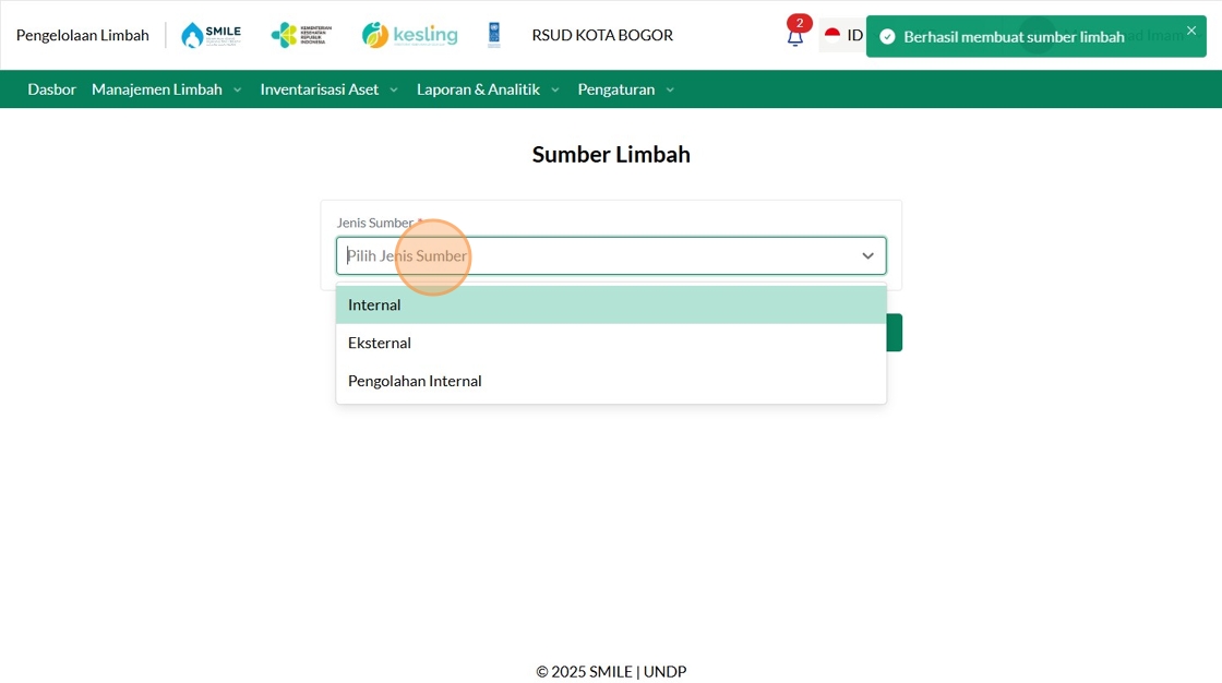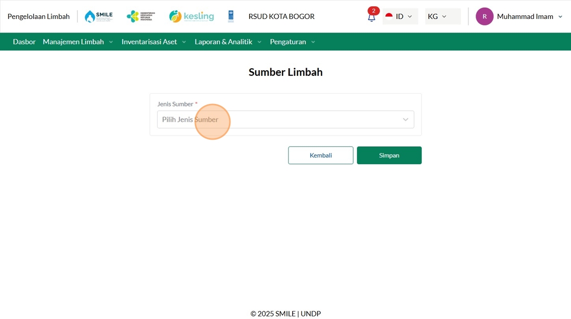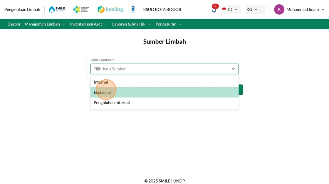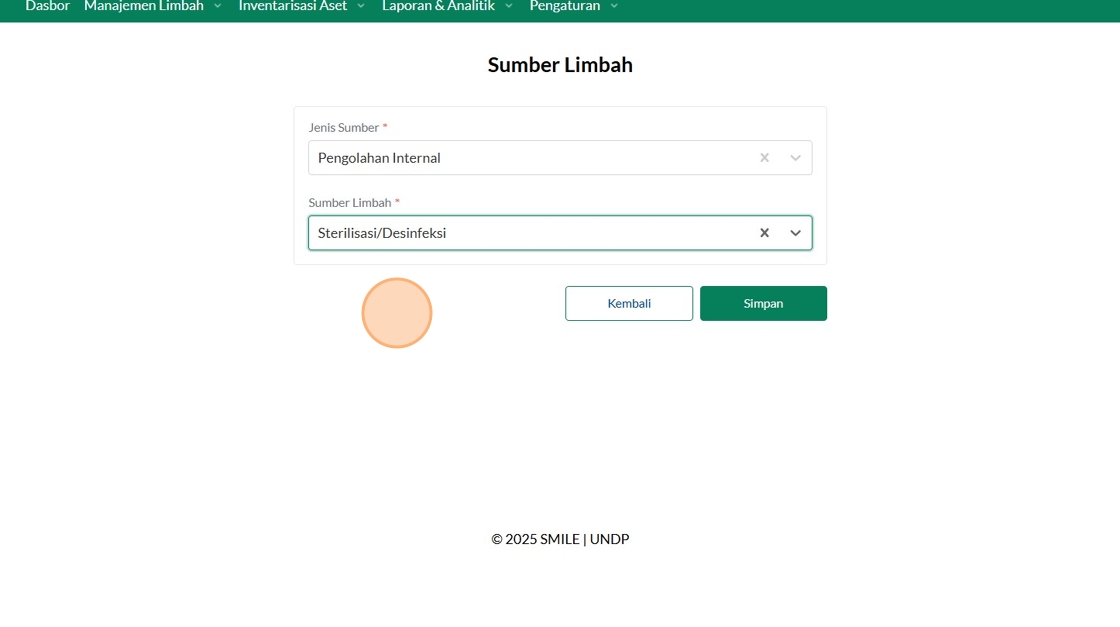 21. Click "Sumber LimbahJenis SumberEksternalPilih FasyankesMasukan Nama FasyankesNama FasyankesKembaliSimpan"