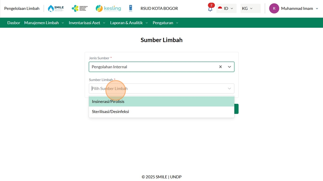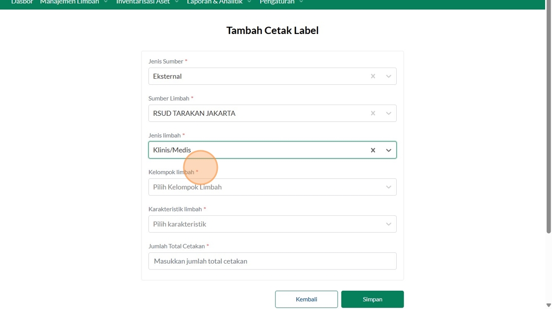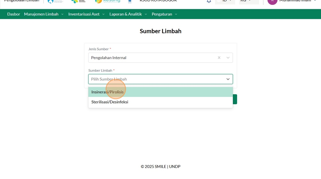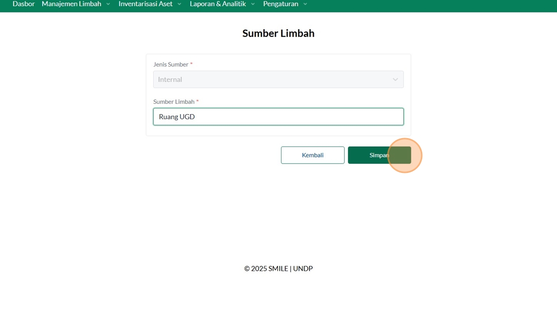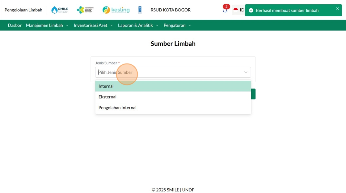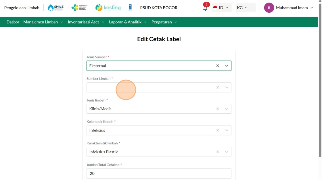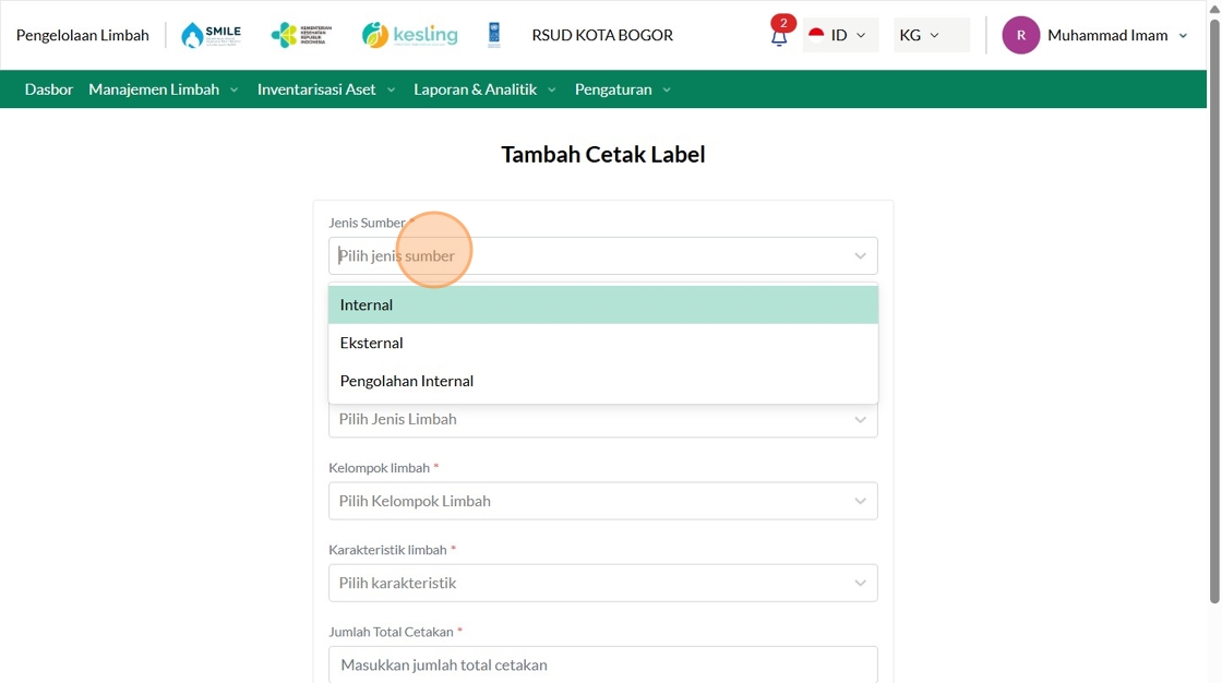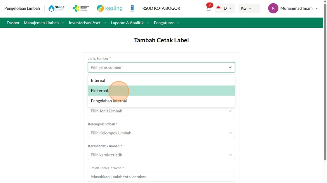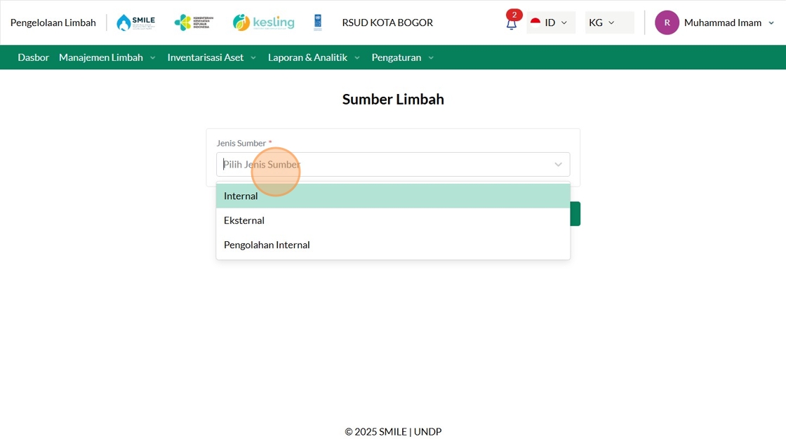 21. Click "Sumber LimbahJenis SumberEksternalPilih FasyankesMasukan Nama FasyankesNama FasyankesKembaliSimpan"