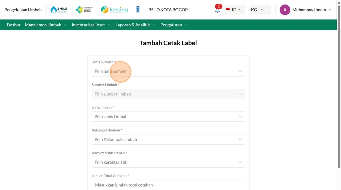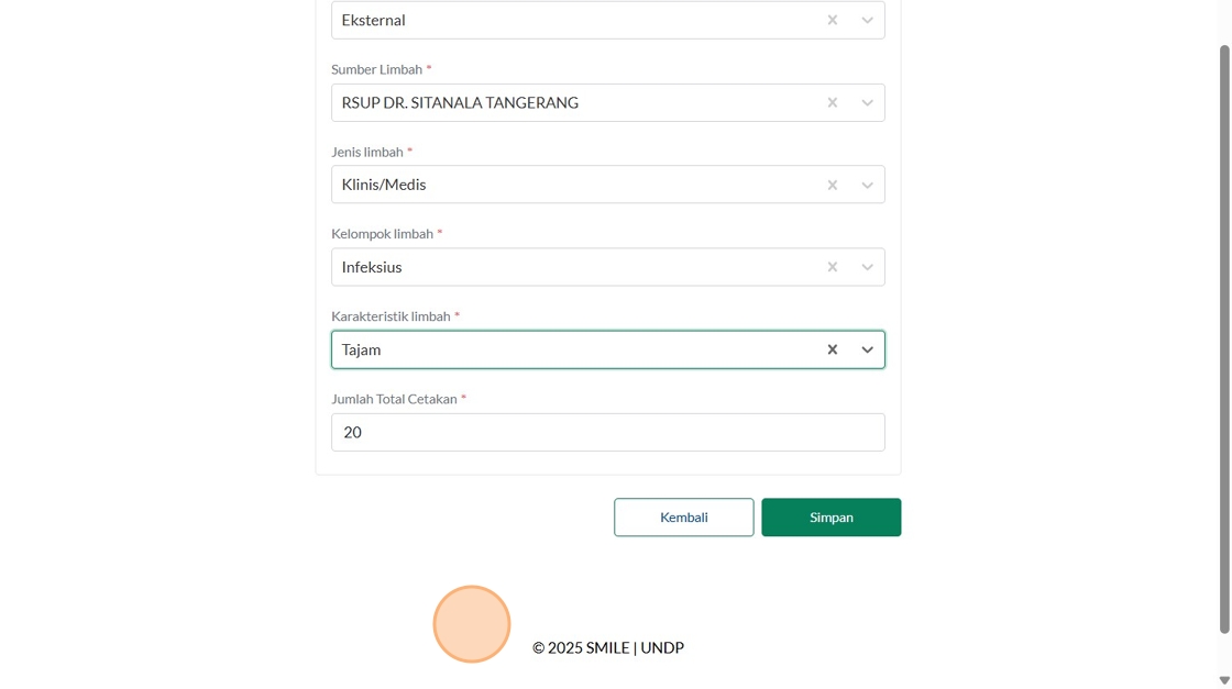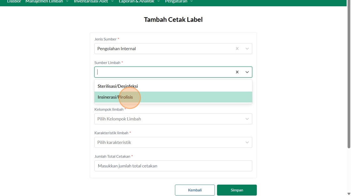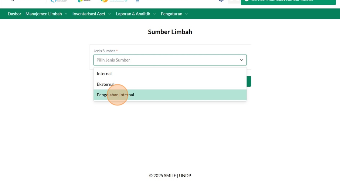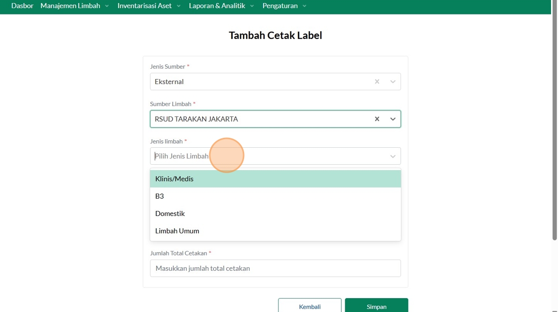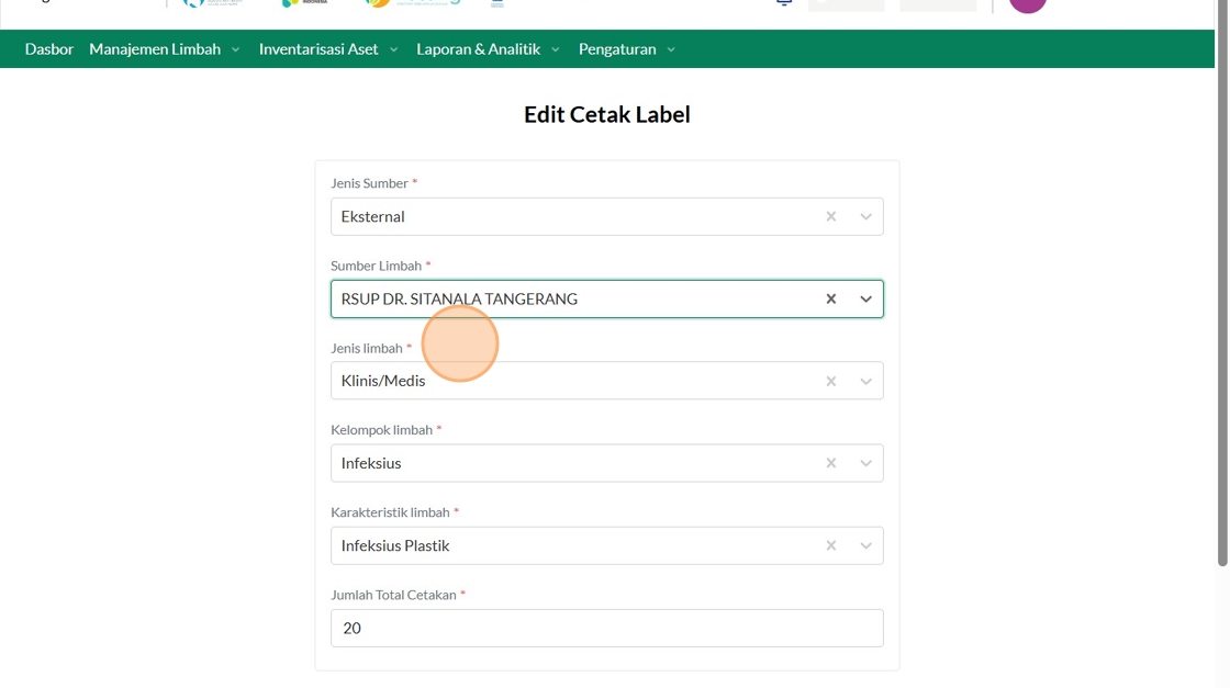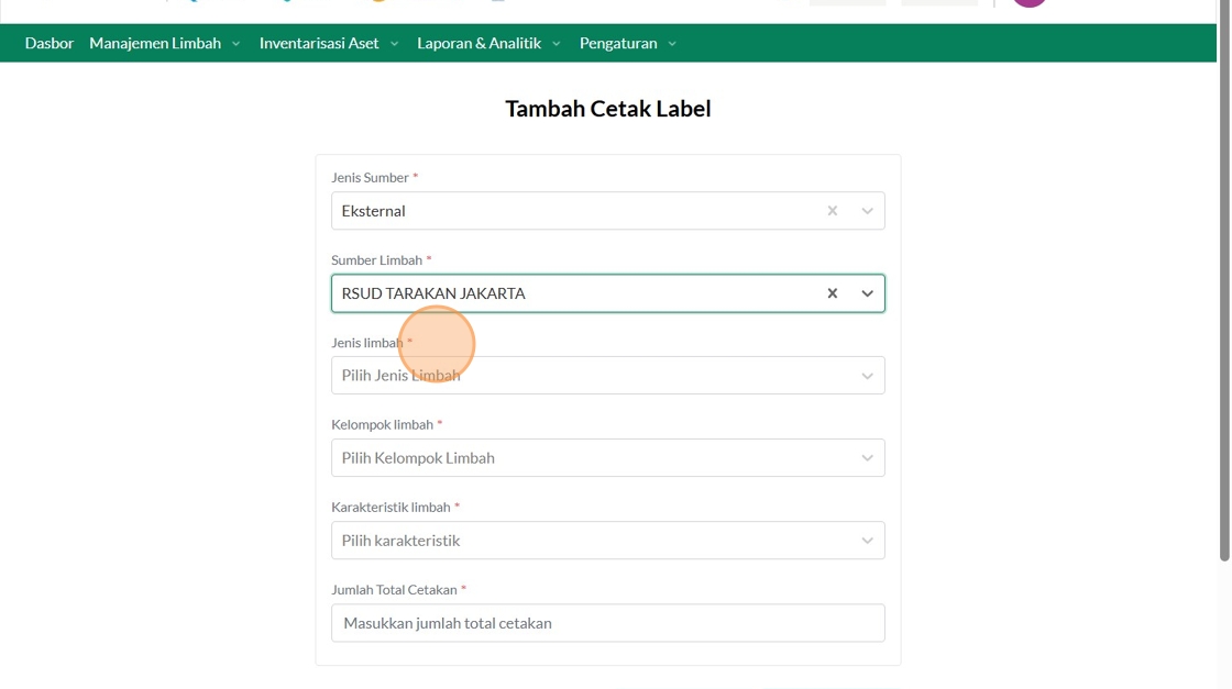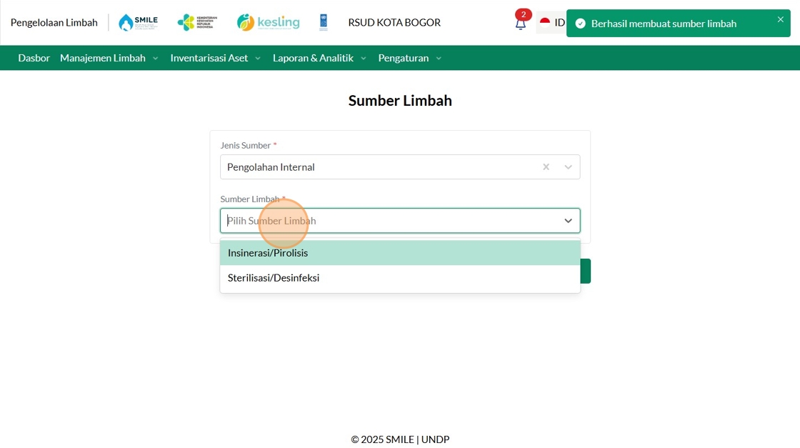 21. Click "Sumber LimbahJenis SumberEksternalPilih FasyankesMasukan Nama FasyankesNama FasyankesKembaliSimpan"