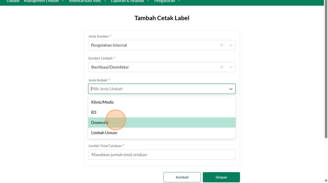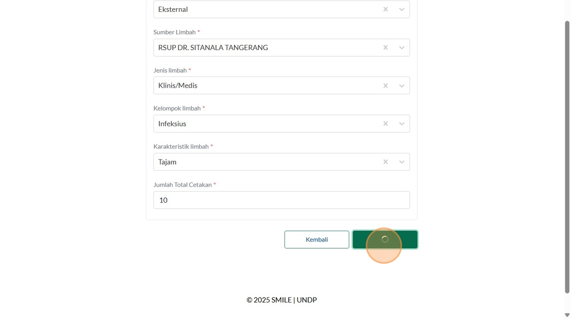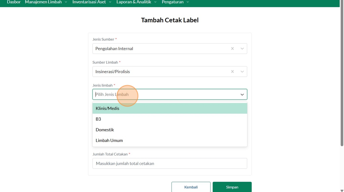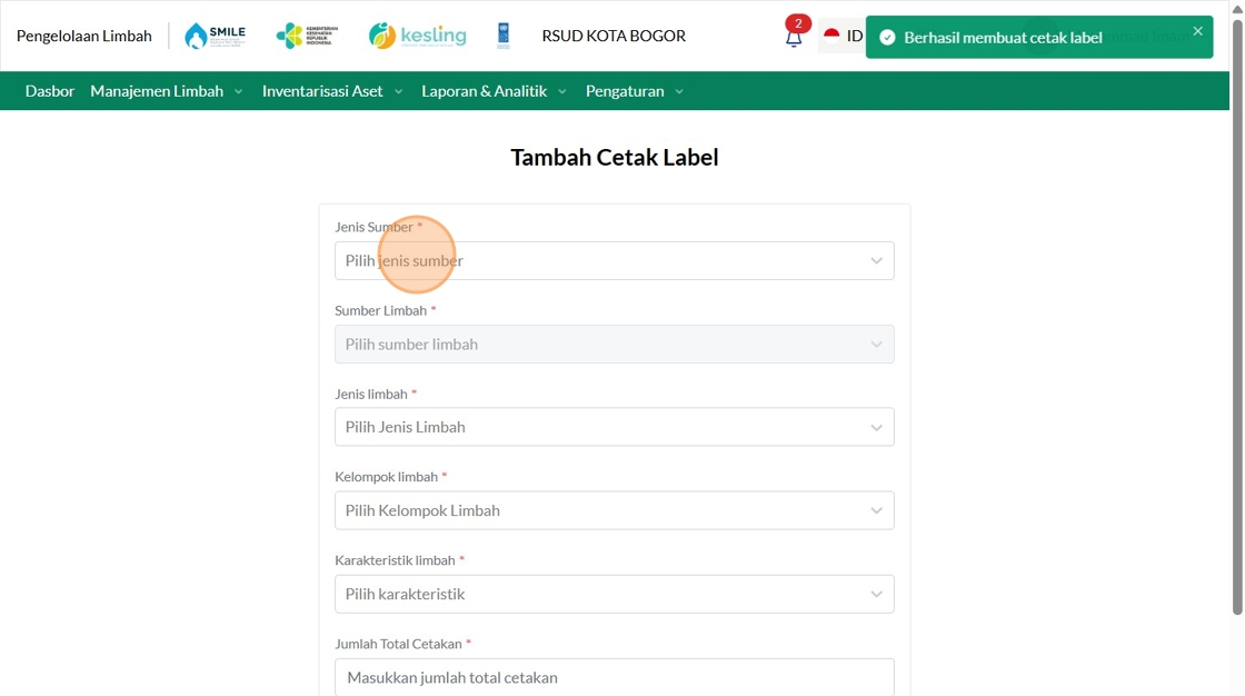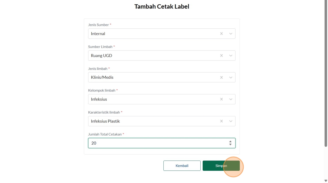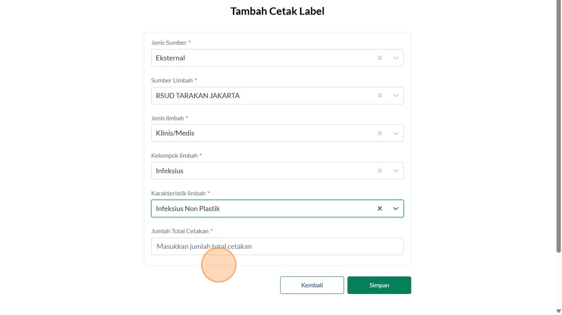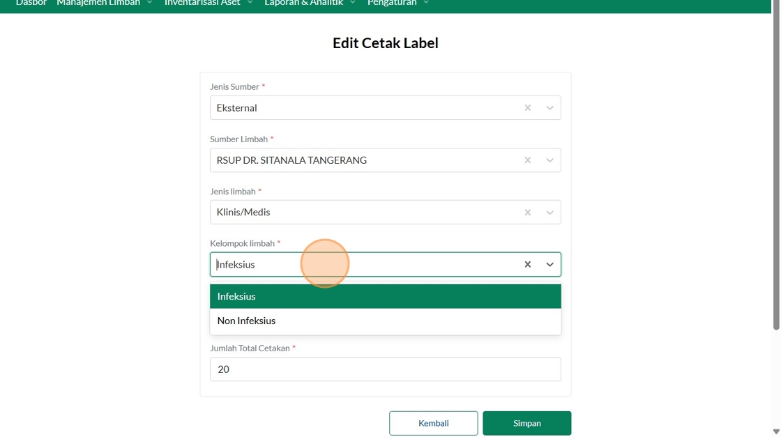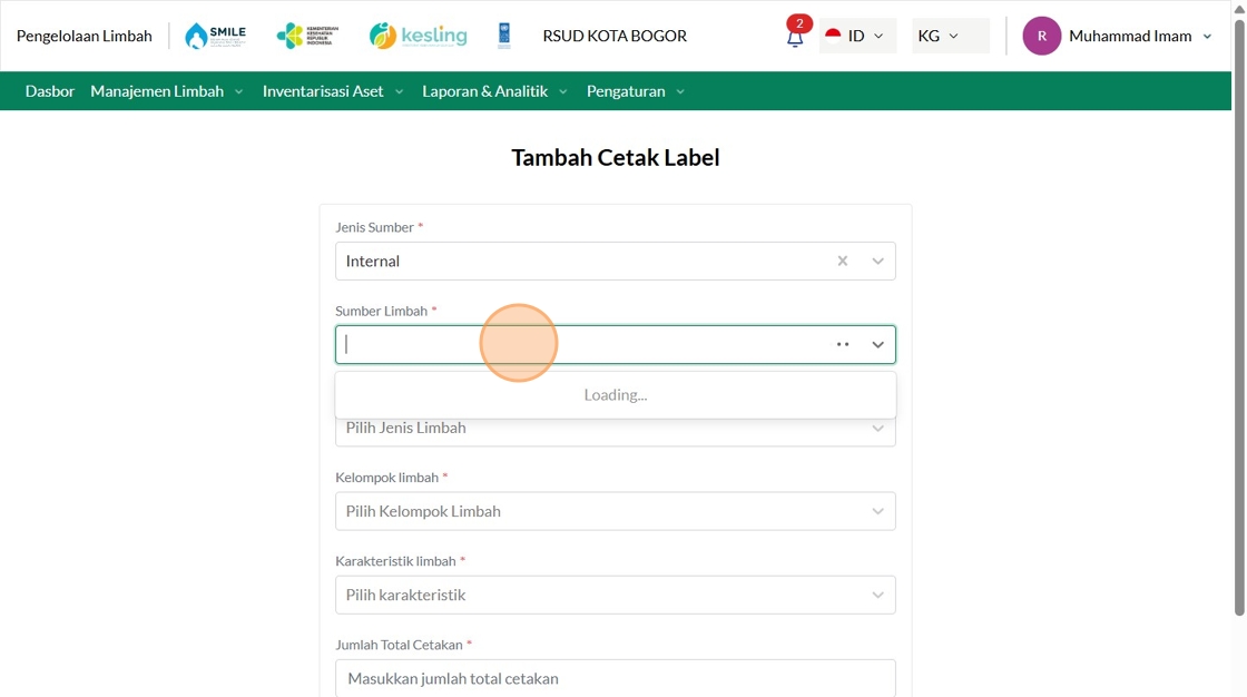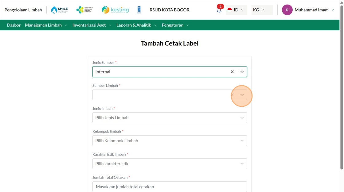 21. Click "Sumber LimbahJenis SumberEksternalPilih FasyankesMasukan Nama FasyankesNama FasyankesKembaliSimpan"