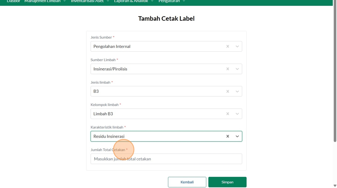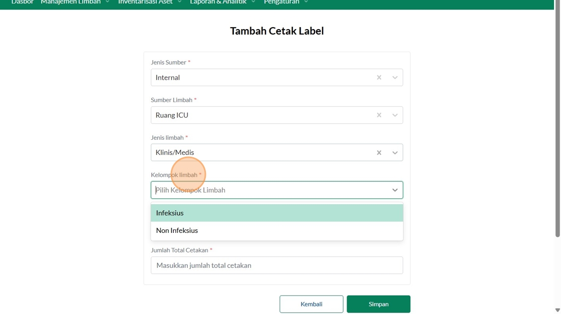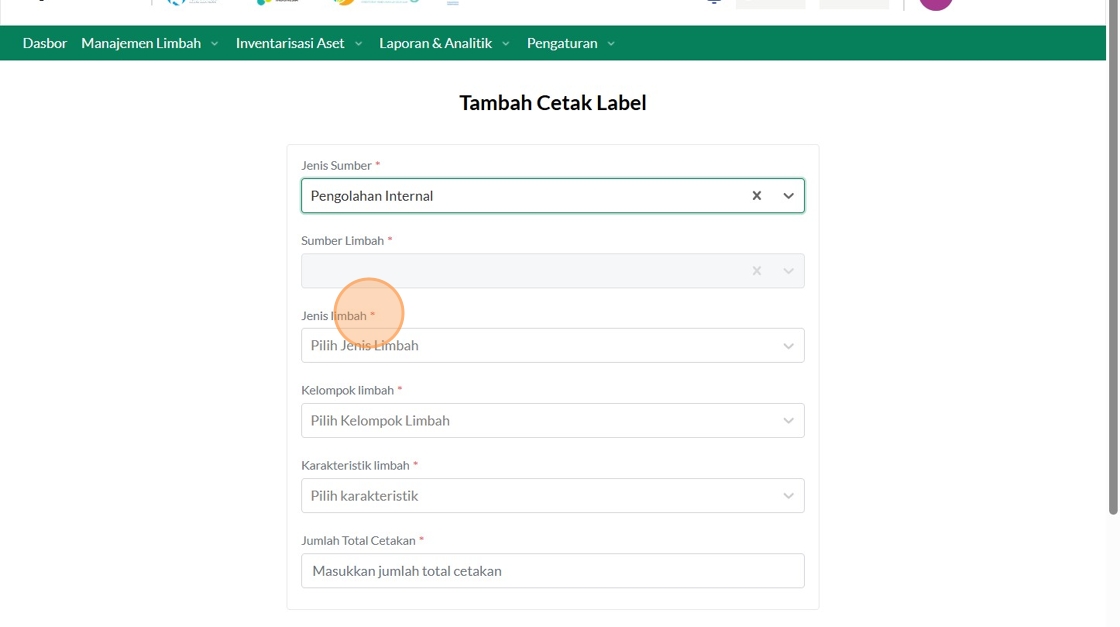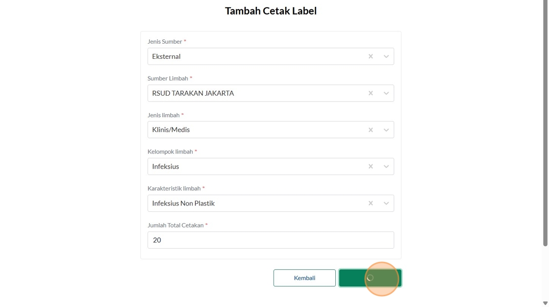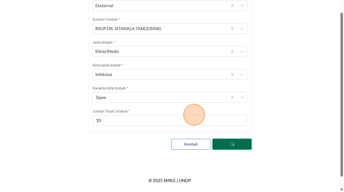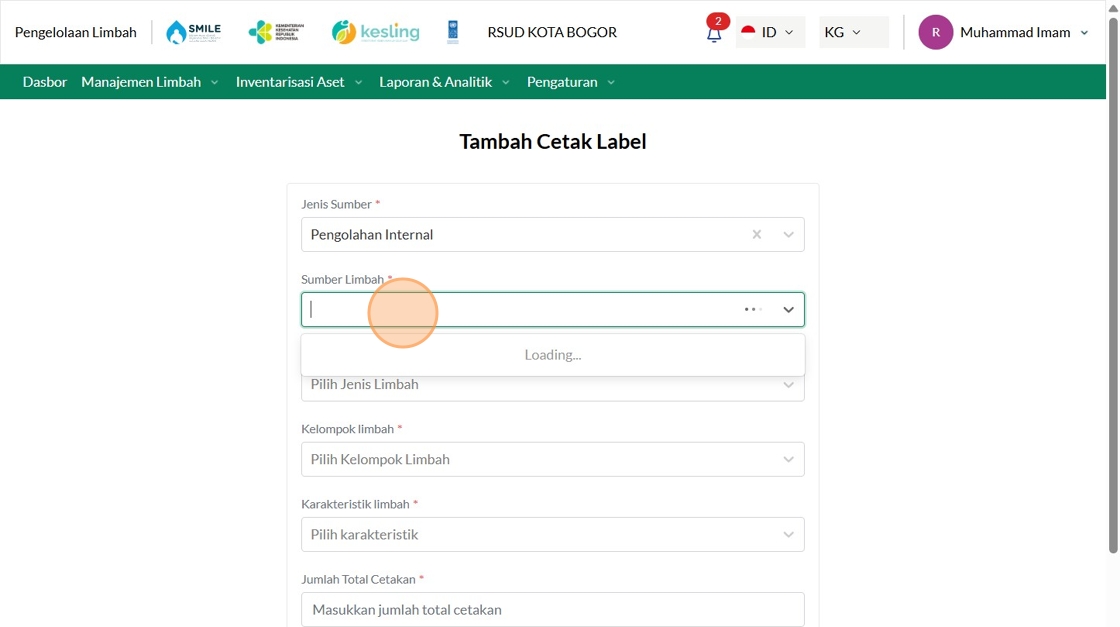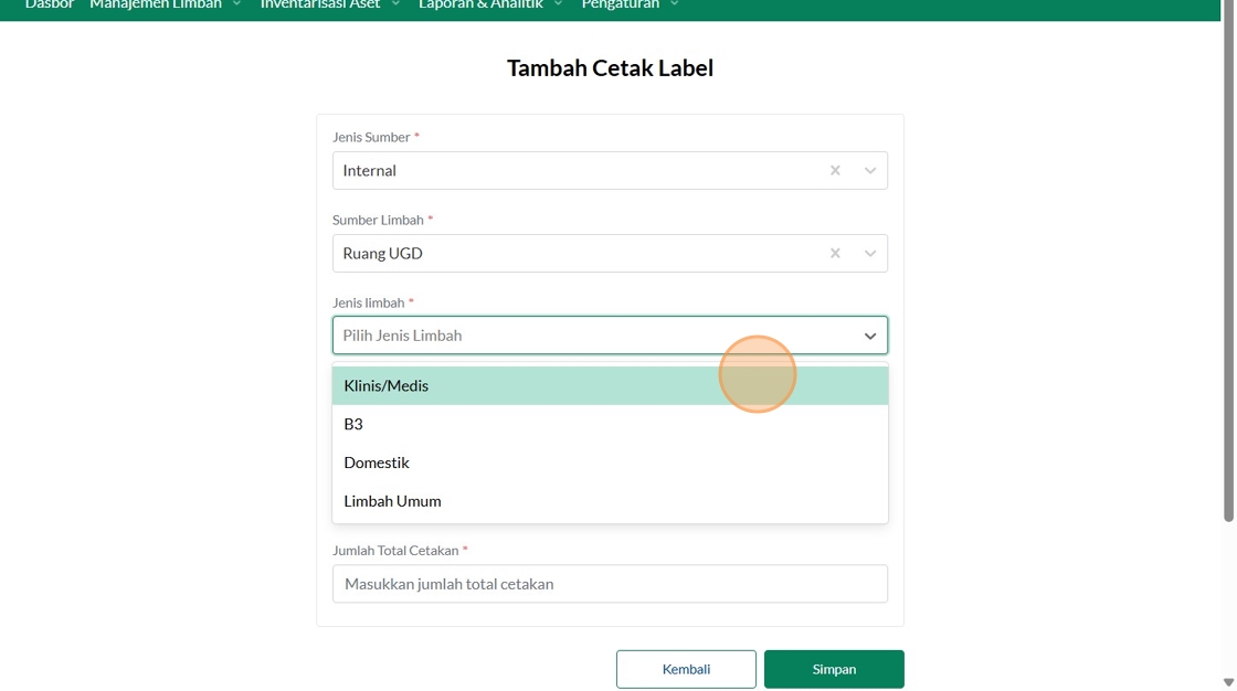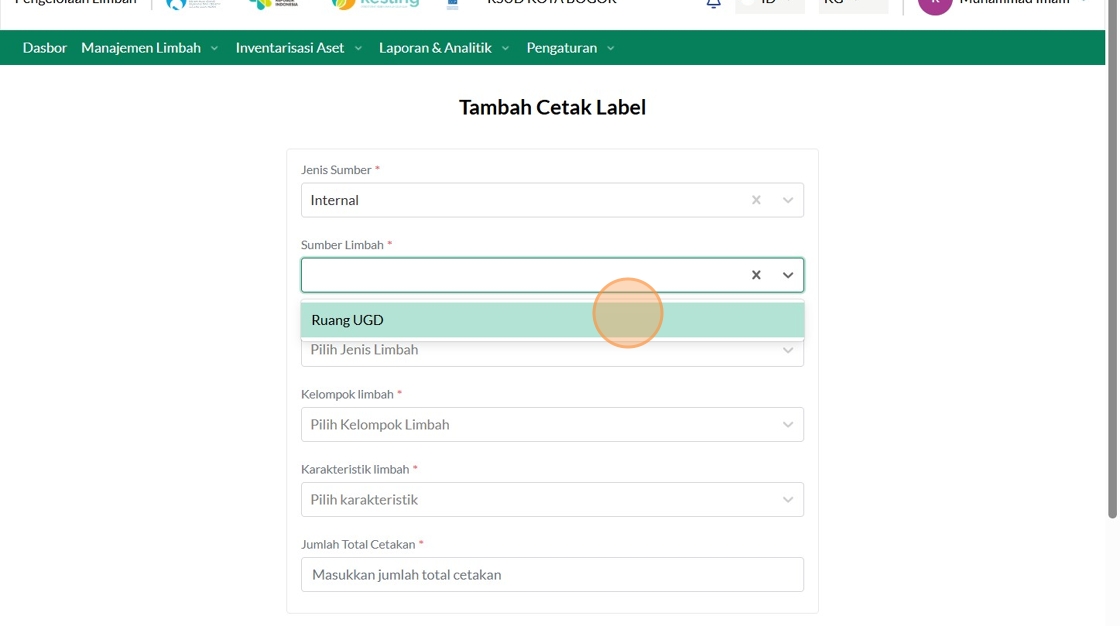 21. Click "Sumber LimbahJenis SumberEksternalPilih FasyankesMasukan Nama FasyankesNama FasyankesKembaliSimpan"
