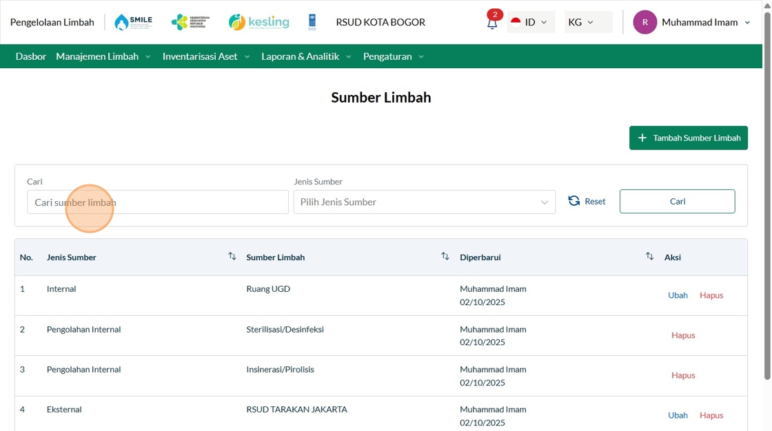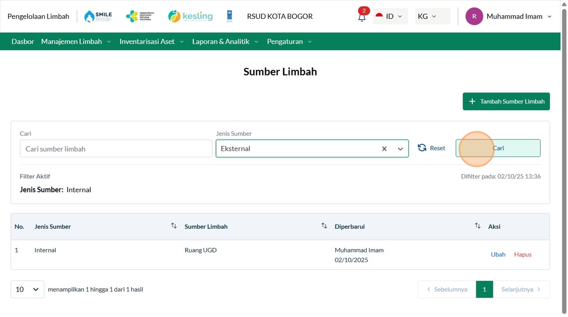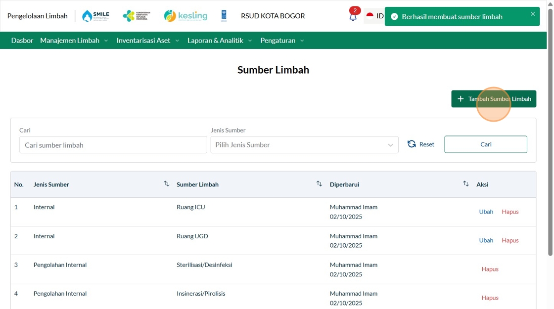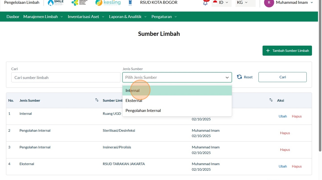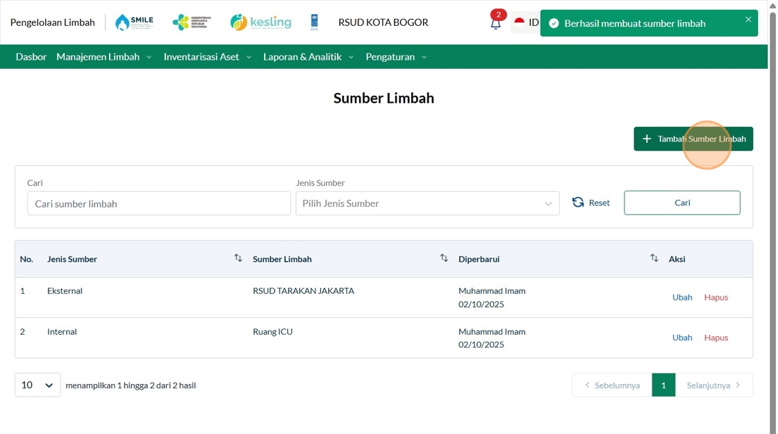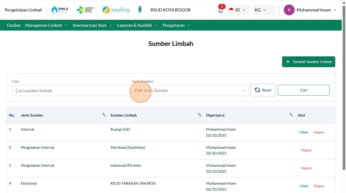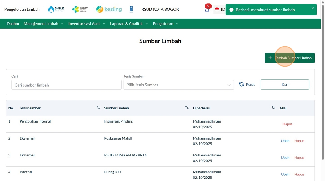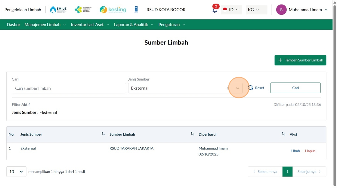 52. Click "No.Jenis SumberSumber LimbahDiperbaruiAksi1EksternalRSUD TARAKAN JAKARTAMuhammad Imam02/10/2025UbahHapus10menampilkan 1 hingga 1 dari 1 hasilSeb..."