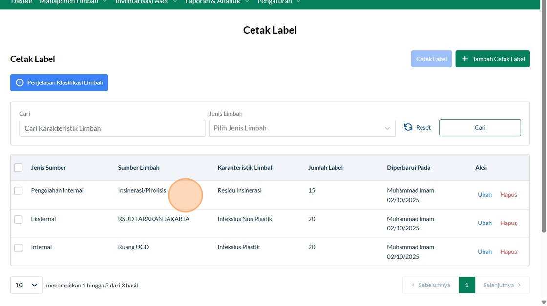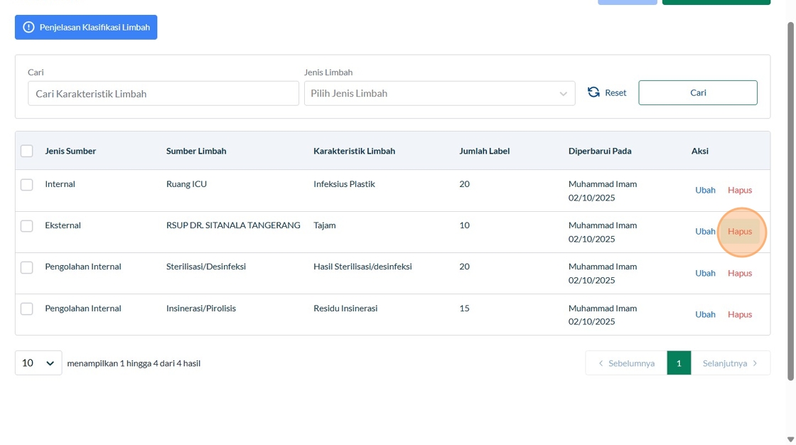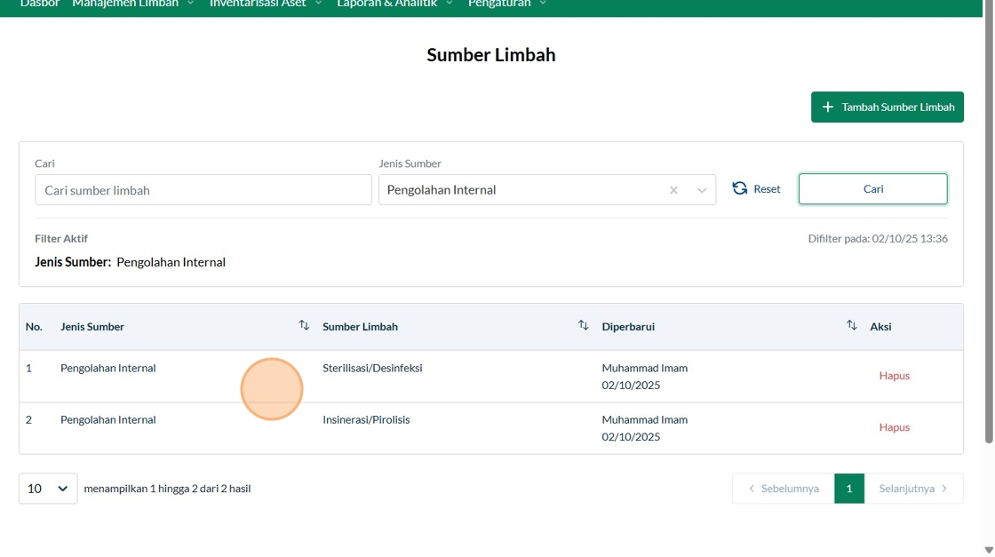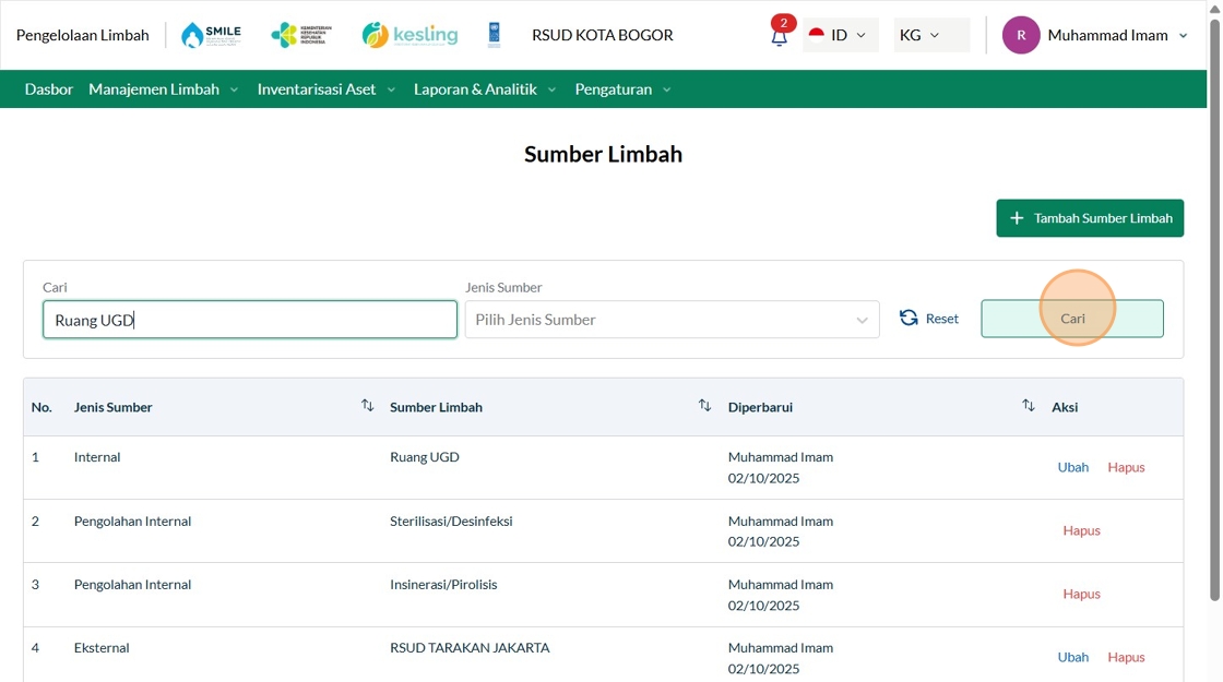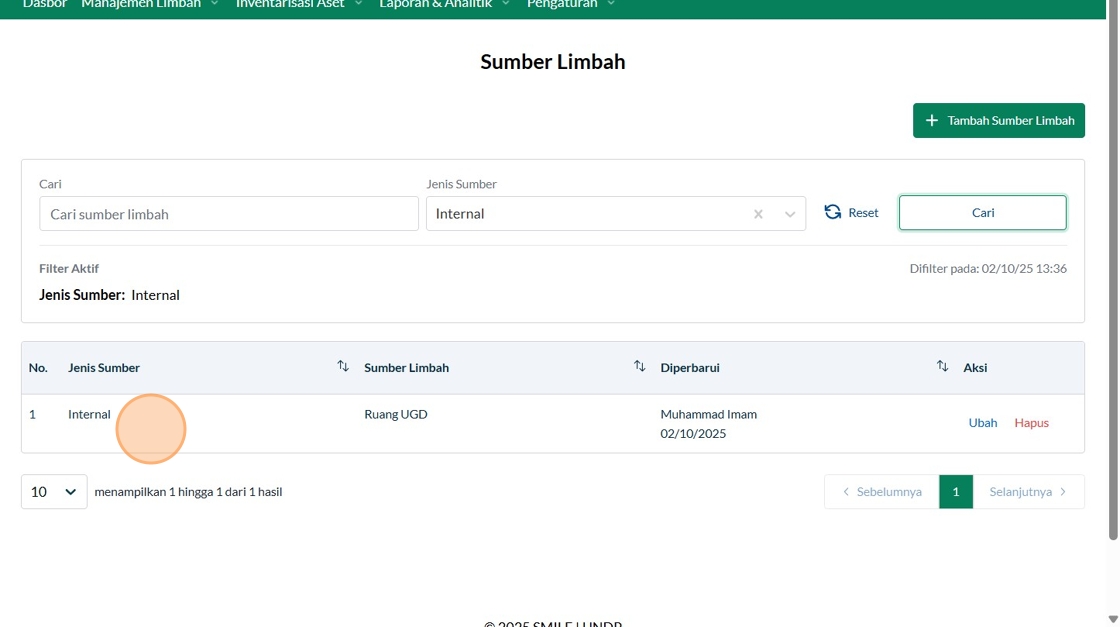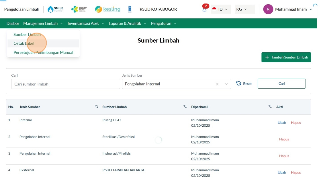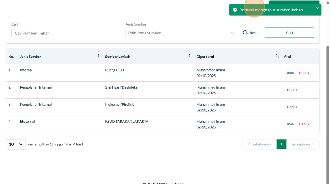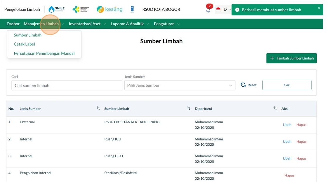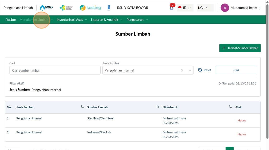 52. Click "No.Jenis SumberSumber LimbahDiperbaruiAksi1EksternalRSUD TARAKAN JAKARTAMuhammad Imam02/10/2025UbahHapus10menampilkan 1 hingga 1 dari 1 hasilSeb..."