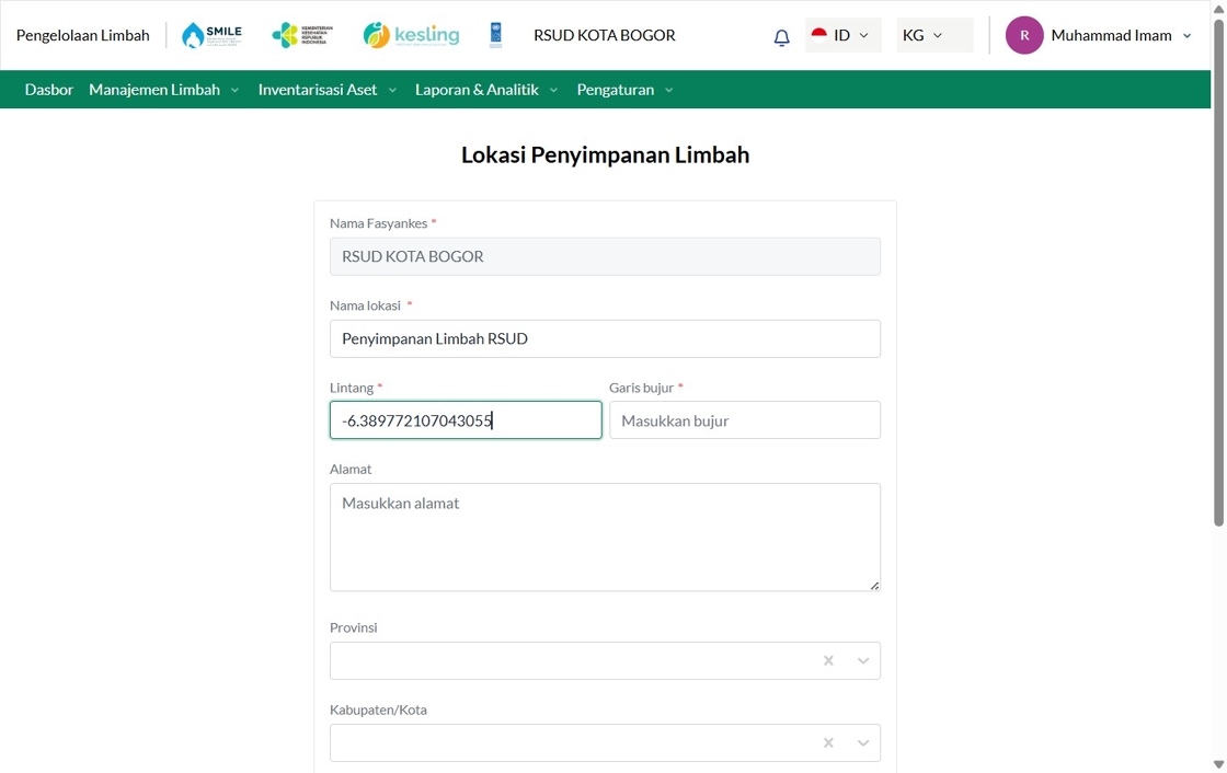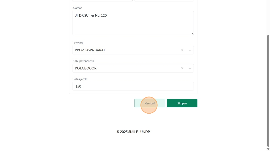 8. Click "Nama FasyankesNama lokasi LintangGaris bujurAlamatProvinsiKabupaten/KotaBatas jarak KembaliSimpan"