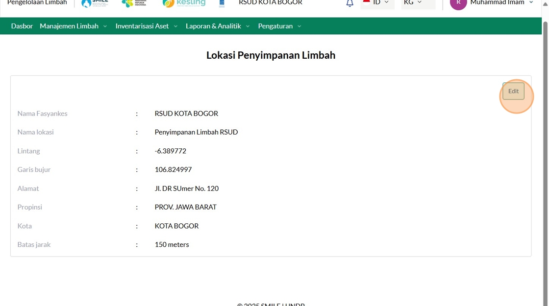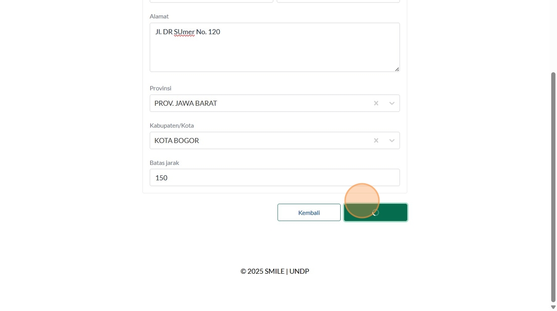 20. Click "Nama FasyankesNama lokasi LintangGaris bujurAlamatJl. DR SUmer No. 120ProvinsiPROV. JAWA BARATKabupaten/KotaKOTA BOGORBatas jarak Kembali"